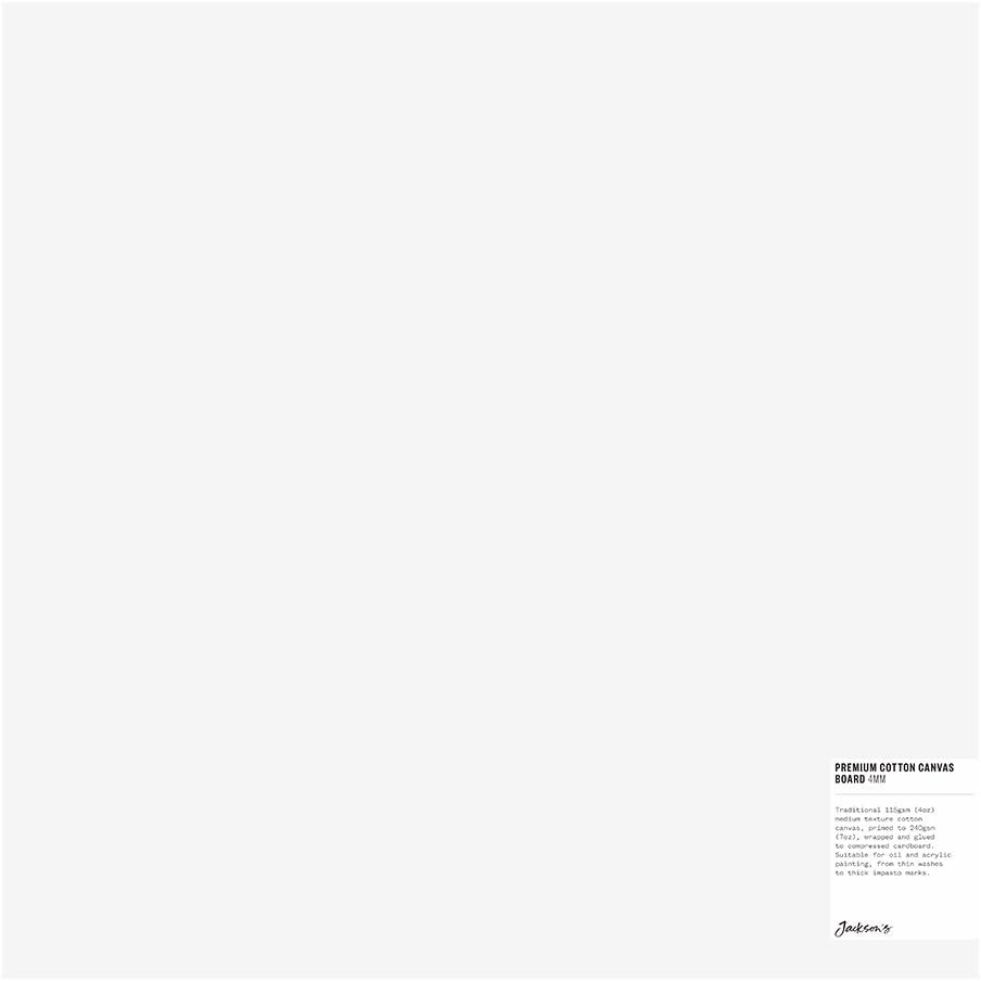 The 115gsm (4oz) traditional medium texture weave cotton used on these Premium Cotton Canvas Boards is suitable for oil and acrylic painting - from thin washes to thick impasto marks, and is universally primed to 240gsm (7oz) to protect the natural fibres of the cotton. Each board is 4mm thick and extremely rigid, with the canvas wrapped around the edges and glued to compressed cardboard. This is a single Premium Cotton Canvas Art Board, 4mm, 16x16in (40x40cm)