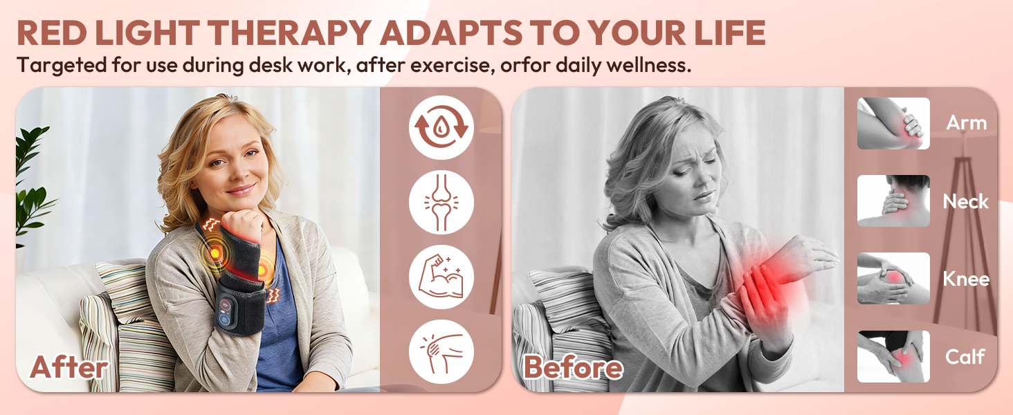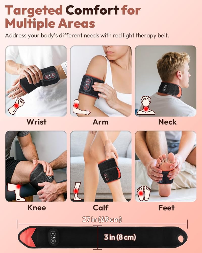 Targeted Comfort with Infrared Red Light Therapy: Featuring dual 660nm & 850nm wavelengths through 36 LEDs, our red light therapy belt can be used on areas such as the wrist, arm, neck, shoulder, foot, and knee. Designed for your everyday life, it is suitable for post-workout or daily routines.