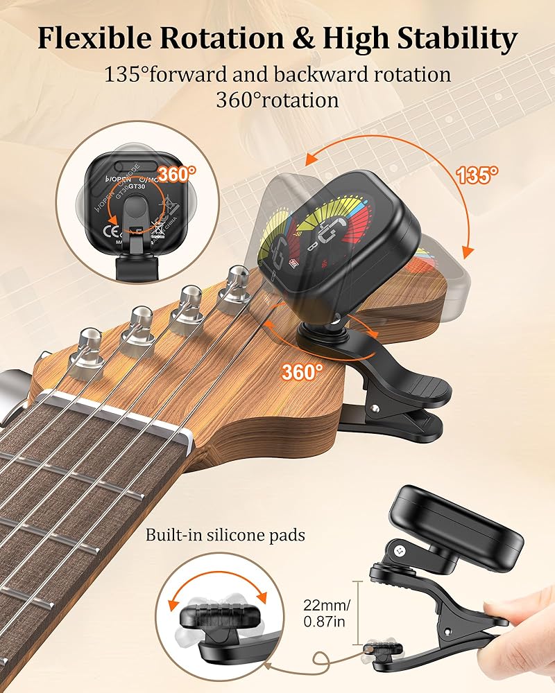 【360° Rotatable Screen】Adjust the screen to your preferred viewing angle—perfect for stage, studio, or practice. Silicone-padded clamp grips securely without damaging your instrument.