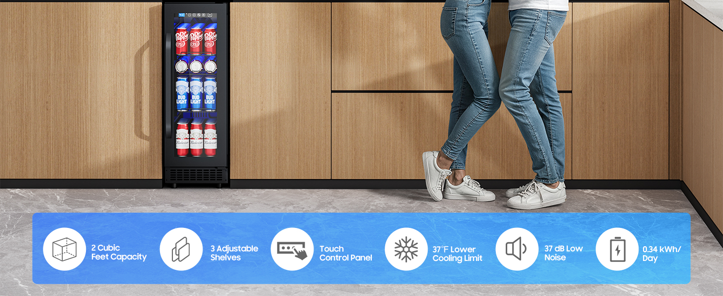 【Upgraded Beverage Refrigerator】This beverage fridge adopts advanced air cooling technology. The 360° full-angle circulating air duct ensures more even cooling. Equipped with a tempered glass door with low-e film and a high-tightness door seal, it achieves efficient refrigeration while preventing cold air leakage
