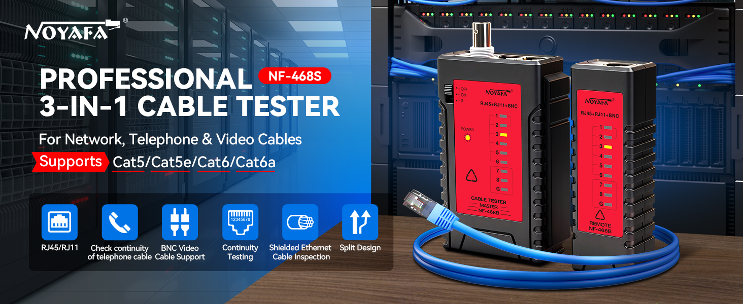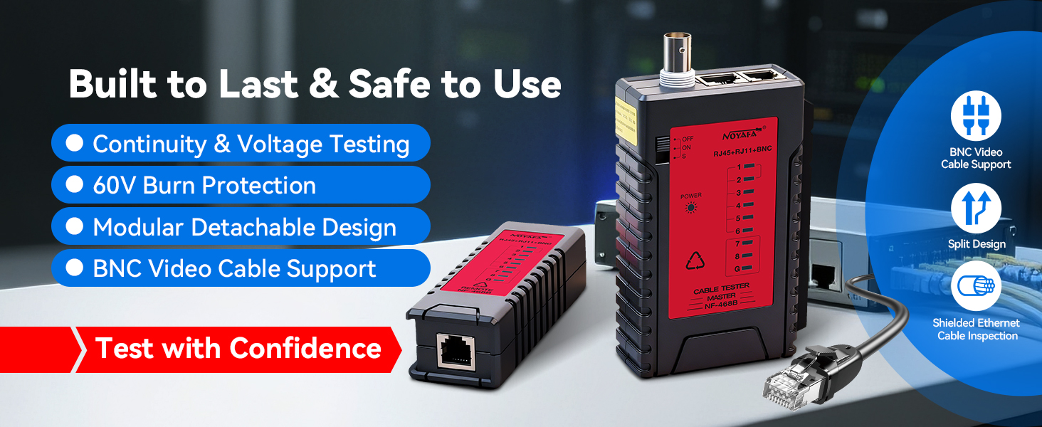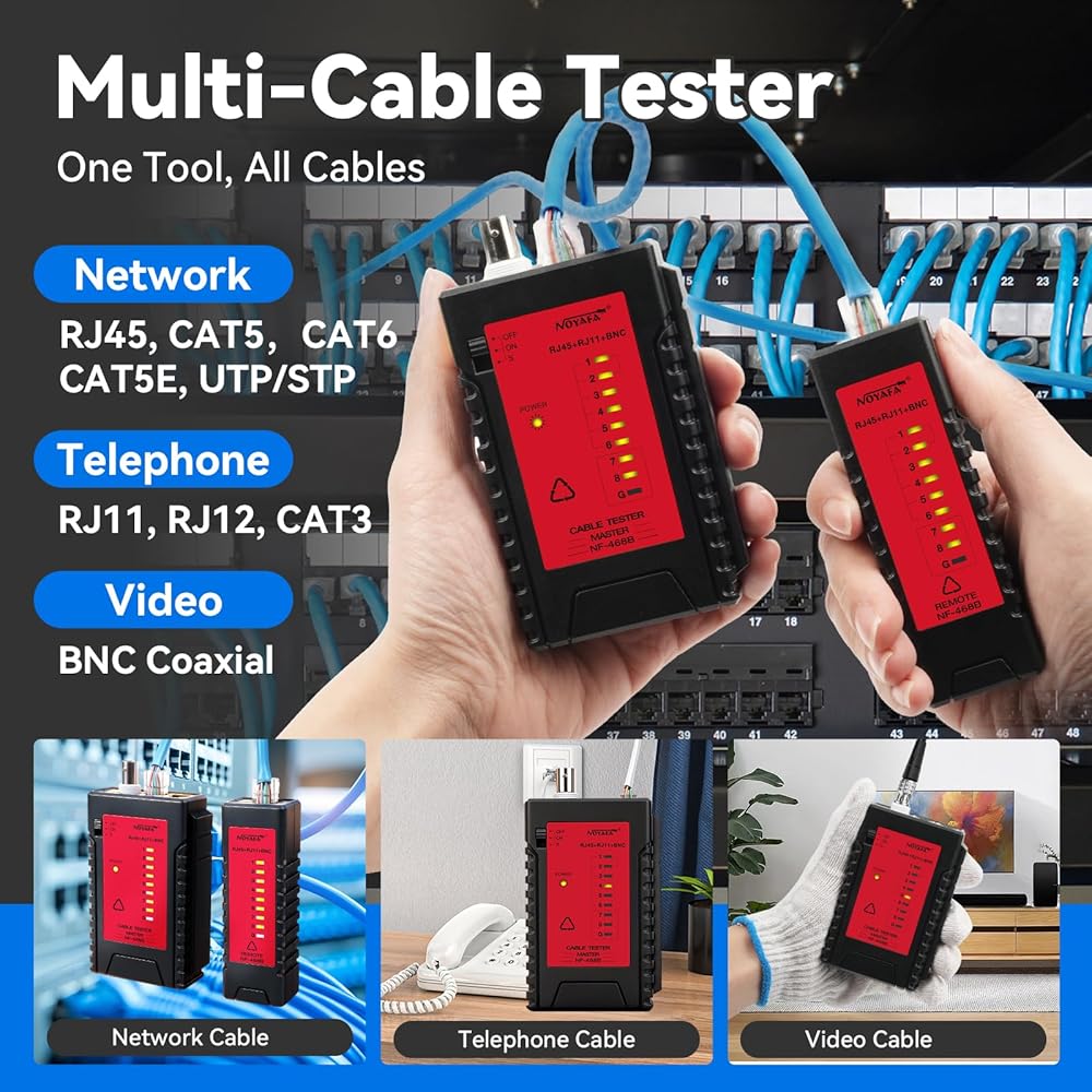 • 【3-IN-1 MULTI-FUNCTION CABLE TESTER】 Versatile 3-in-1 cable tester compatible with network cables (RJ45/CAT5/CAT5E/CAT6/CAT6A/CAT7), telephone lines (RJ11/RJ12), and video coaxial cables (BNC). Supports UTP/STP and CAT3 cables, providing all-in-one diagnostic testing for home, office, and professional use.