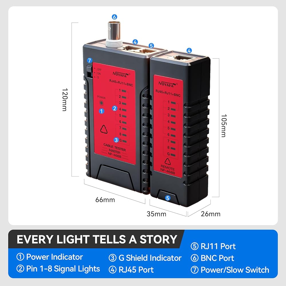 • 【CLEAR LED INDICATORS FOR FAST DIAGNOSIS】 Features bright 8-light LED indicators (1-8+G) that clearly display cable status, including open circuits, short circuits, miswires, crossings, and shielding issues. Delivers quick and accurate results within 1 second for easy and intuitive troubleshooting.