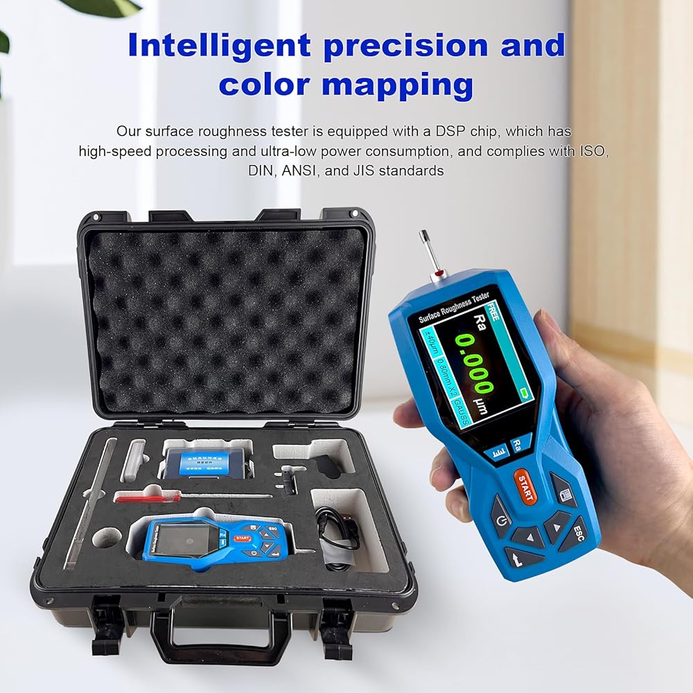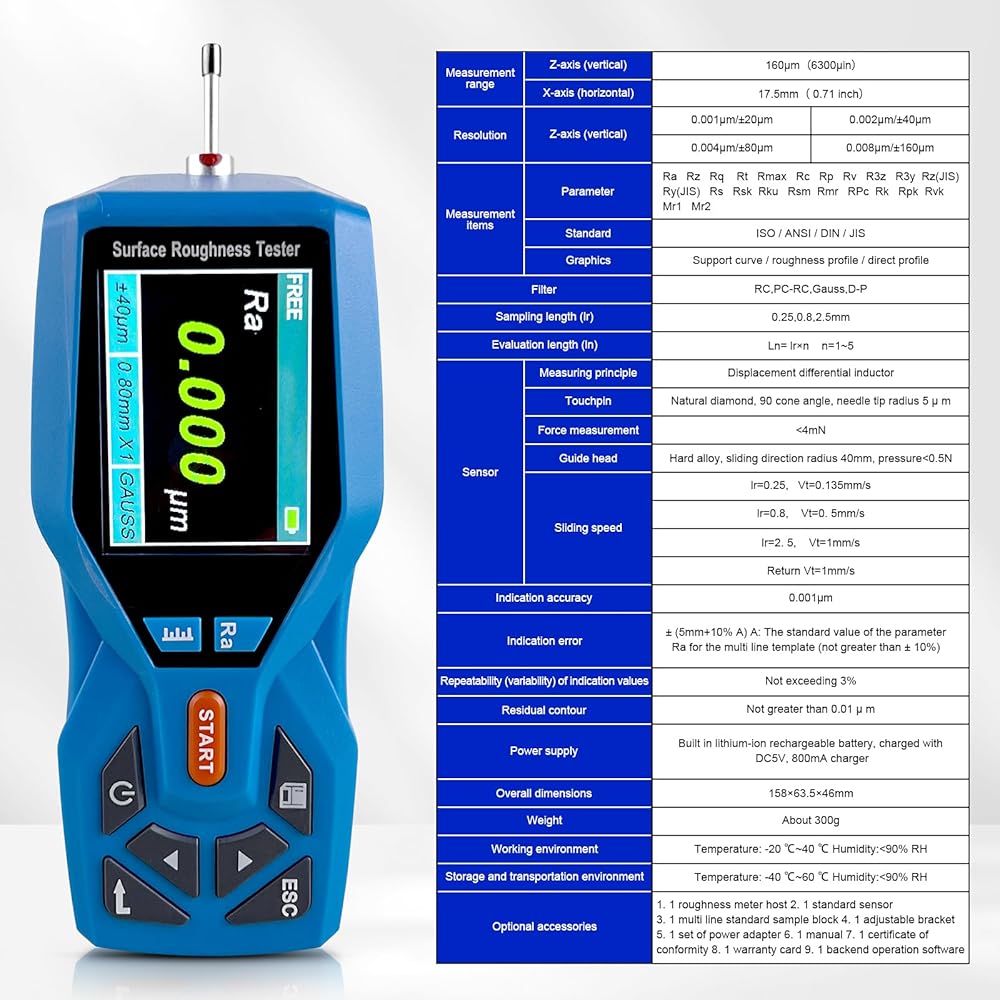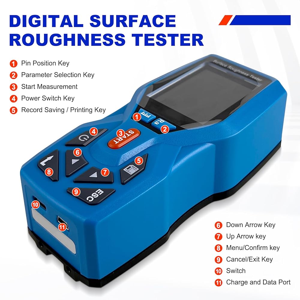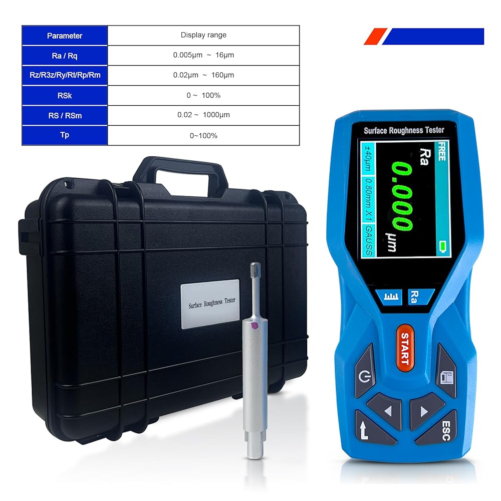 Surface roughness measuring instruments are suitable for production sites and can measure roughness parameters such as Ra/Rq/Rz, R3z, Ry, Rt, Rp, Rm/RSk/RS, and RSm/tp.