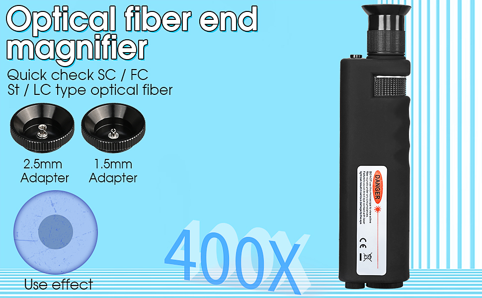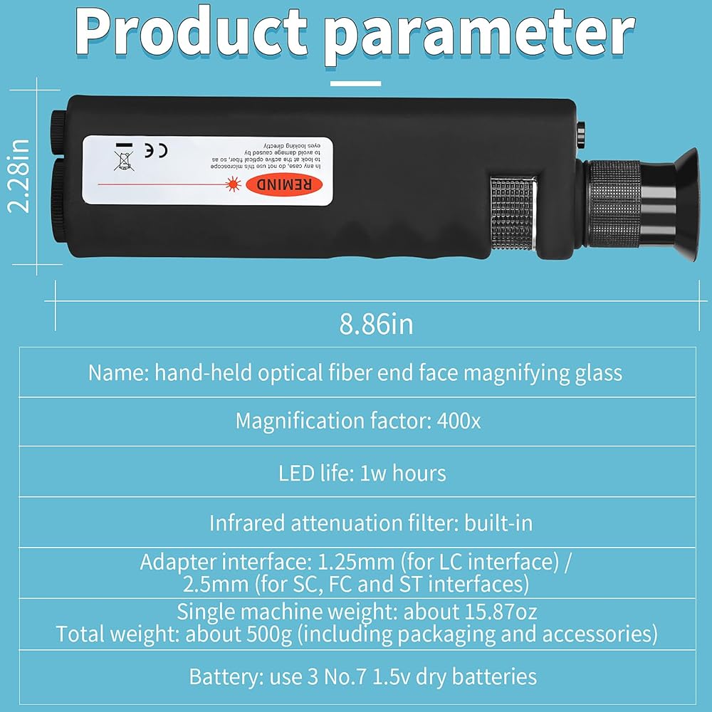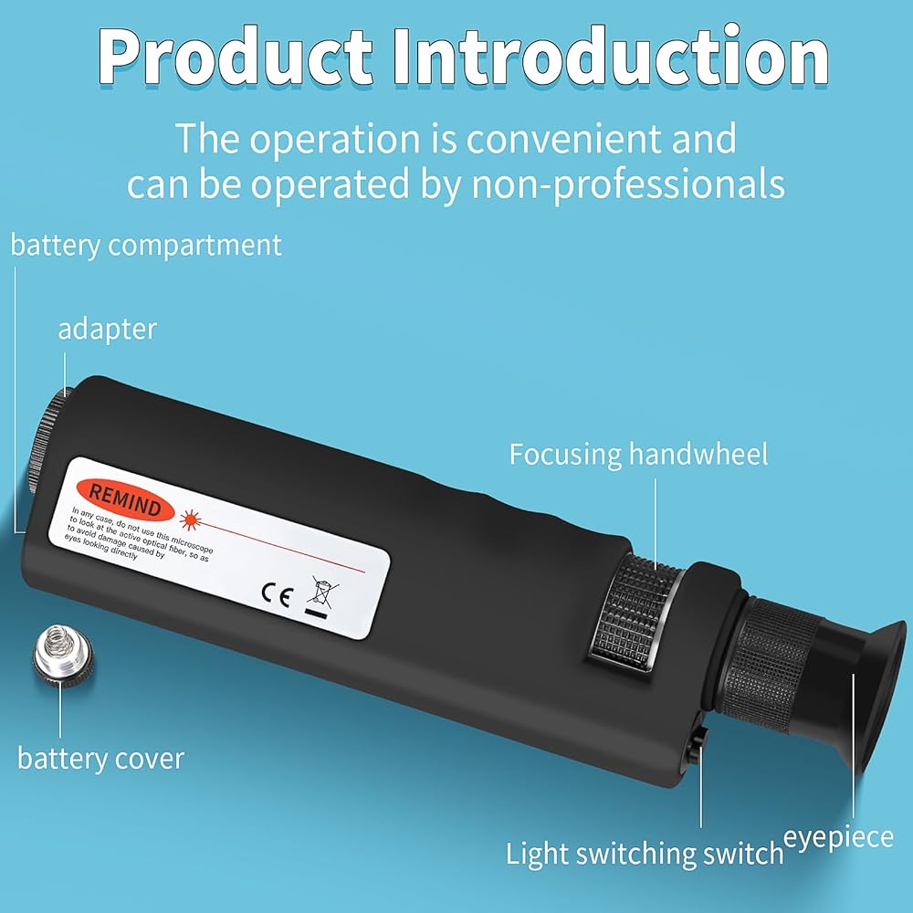 【 Magnification 】 fiber optic magnifying glass provides a 400x magnification effect, allowing for observation of small details such as scratches and dust on the end face of the fiber optic connector. High image clarity, providing high-quality images suitable for fiber optic connector inspection and maintenance.