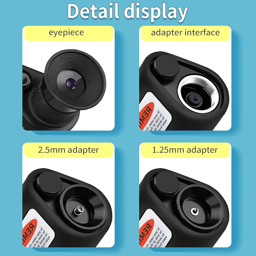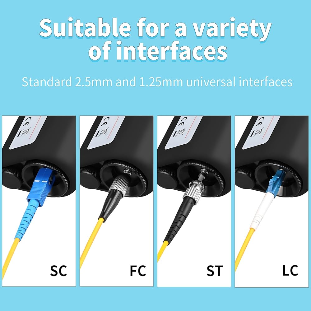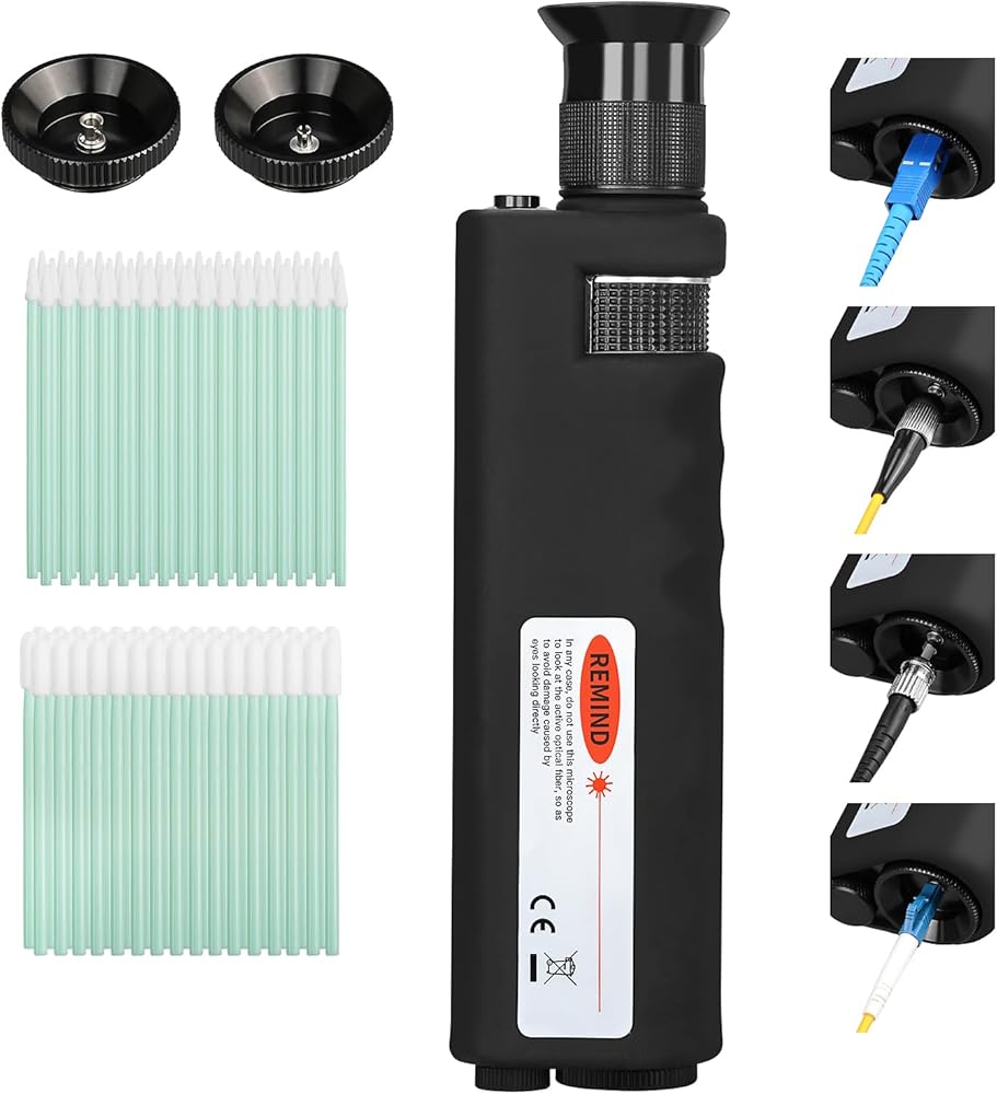 【Wide compatibility】400x fiber optic end face magnifying glass is equipped with a 2.5mm/1.25mm interface, with a 2.5mm adapter compatible with SC/FC/ST interface and a 1.25mm adapter compatible with LC interface. Note: The 1.25mm adapter is located in the small compartment of the packaging bag.Fiber optic cleaning cotton swabs are easy to clean all types of adapters in fiber optic connectors
