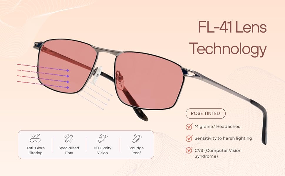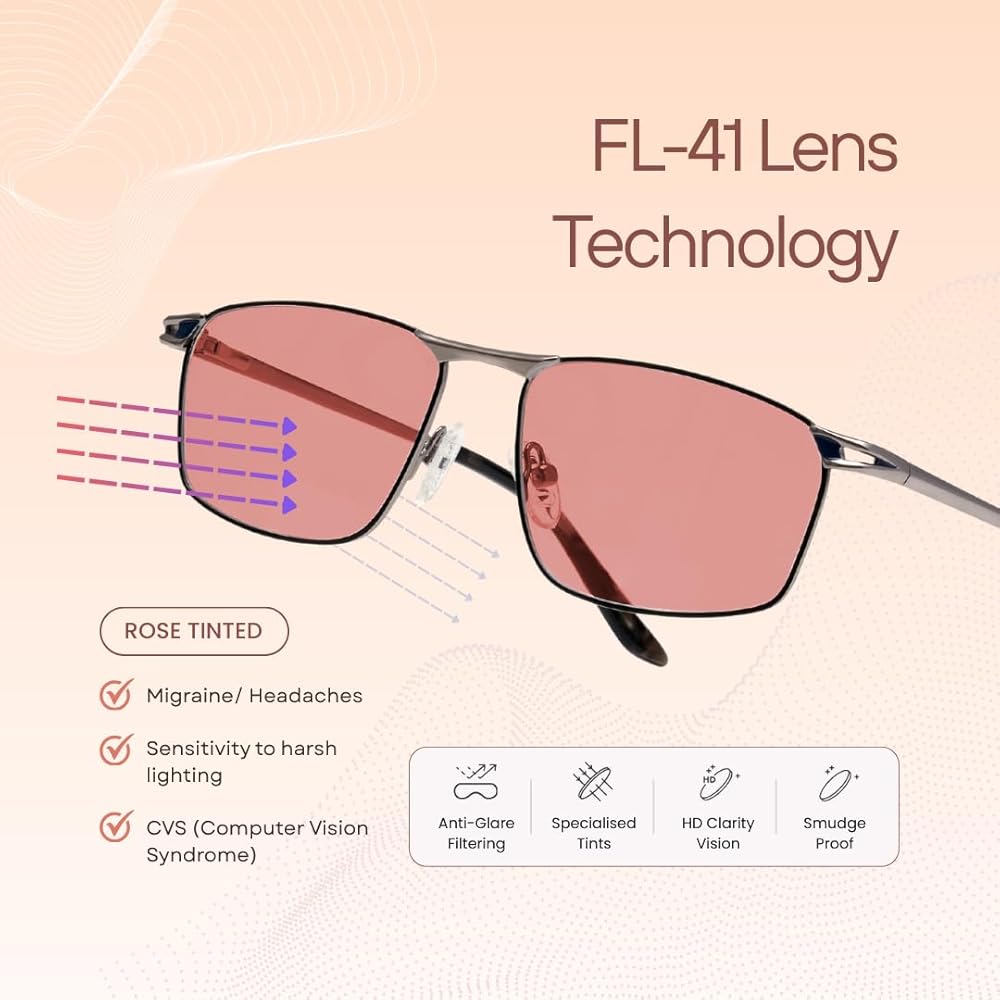 BRADDELL FL-41 Rose Tinted Office Blue Light Glasses for Migraine Light Sensitivity, Concussion and Fluorescent LED Glare (Work)