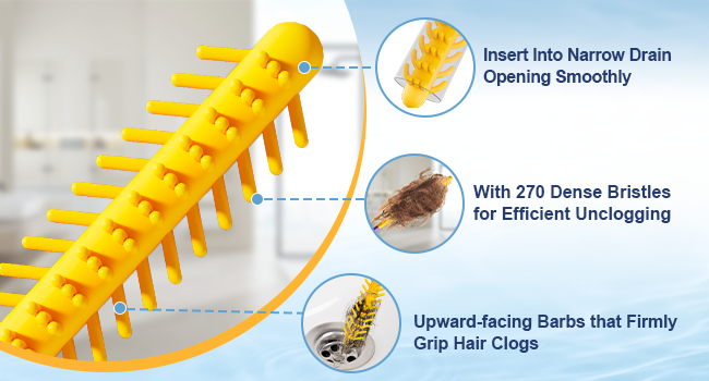 Reusable Drain Snake: Features a 270-bristle brush head that efficiently grabs hair, lint, and soap scum without slipping off. Pull out clogs in seconds to restore smooth drainage, then remove the debris and rinse clean this sink snake for reuse