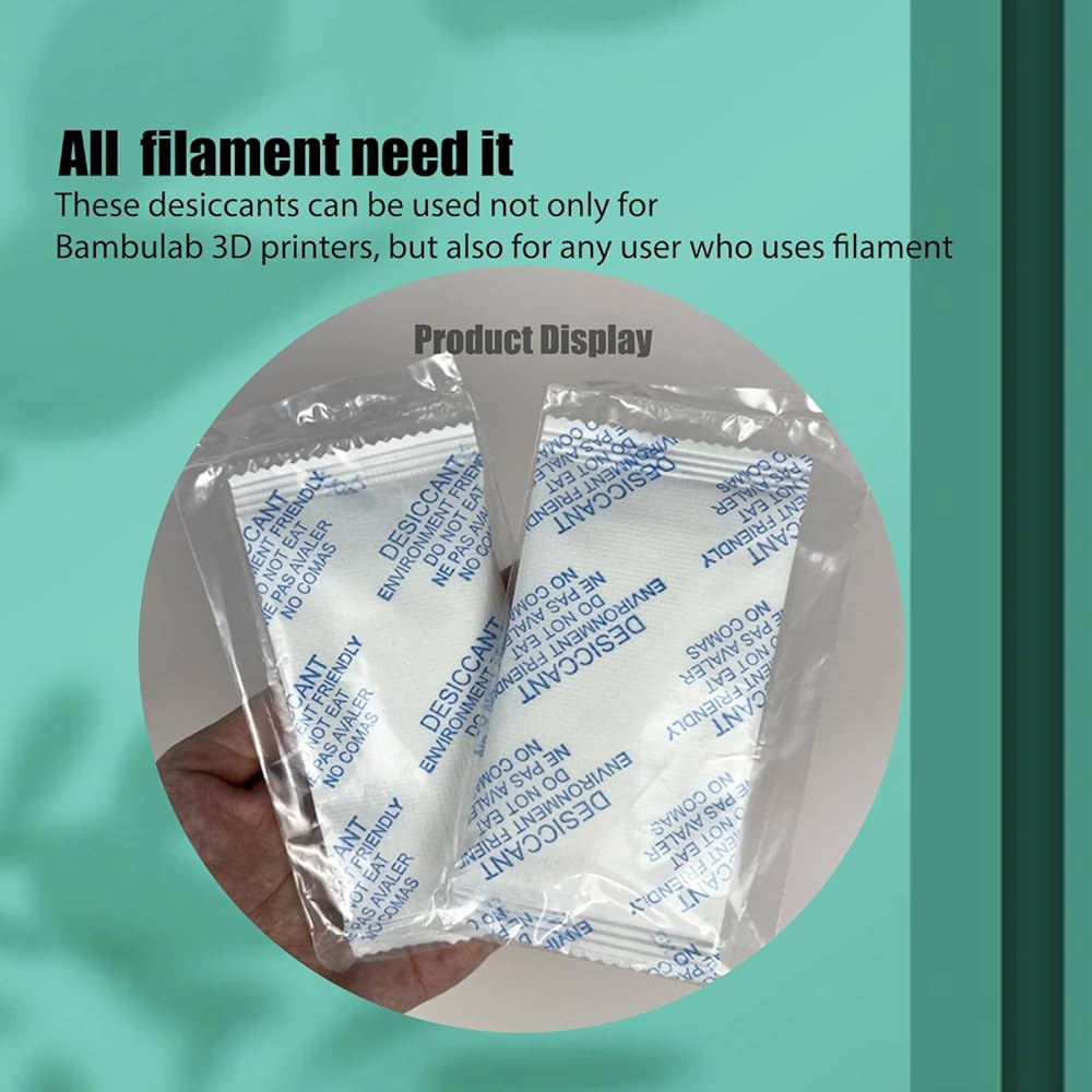 Keep your 3D printer filaments dry and protected with AMS desiccant packs for Bambu Lab P1P P1S X1 X1C AMS and manufacturers custom filament boxes, and compatible with all filament types, these moisture absorbers prevent clogs, weak adhesion, and print failures, ensuring smooth extrusion and consistent high-quality prints.