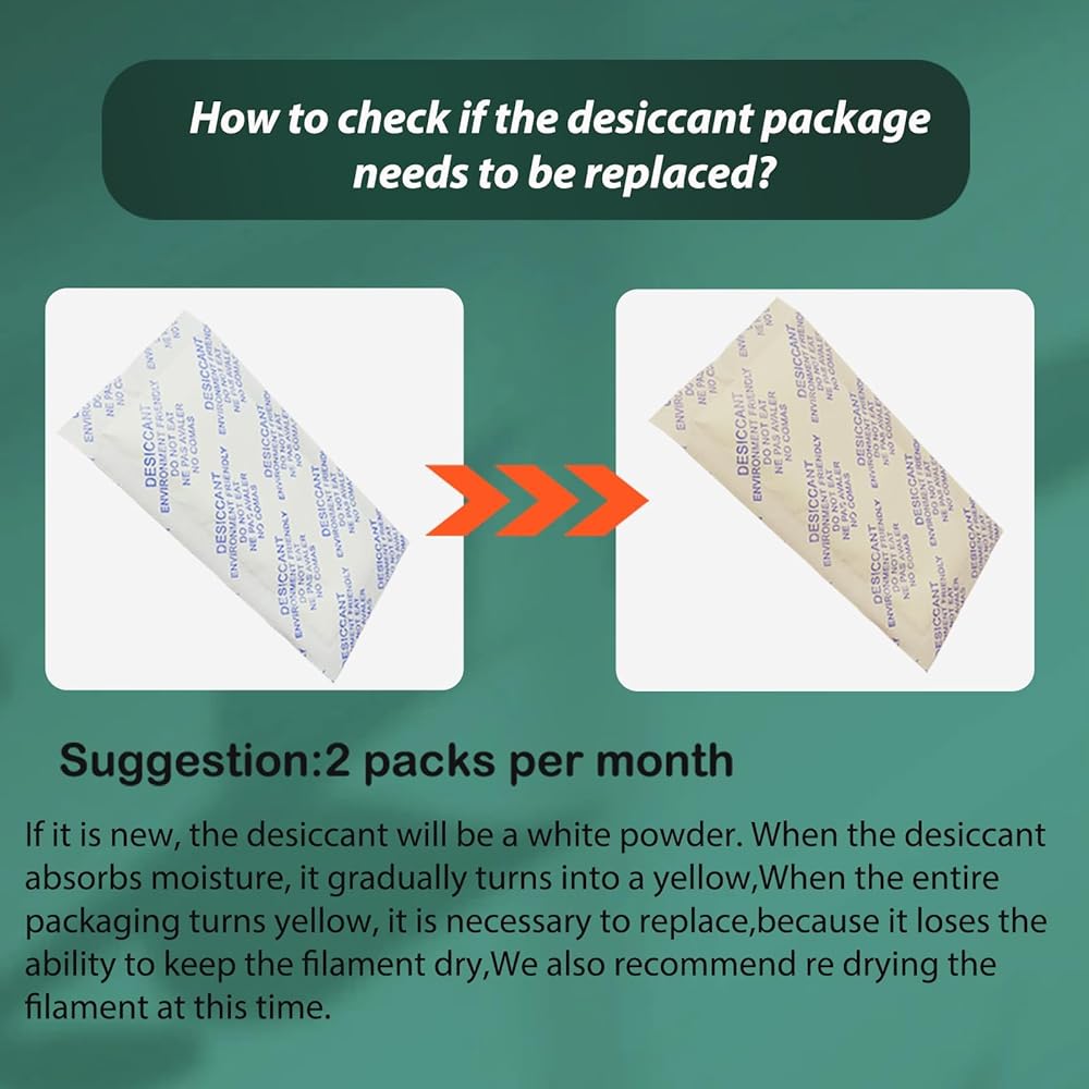 Effective Moisture Control: Each desiccant pack (≈23g) efficiently reduces filament humidity, preventing dampness and ensuring smooth extrusion for consistent 3D printing results