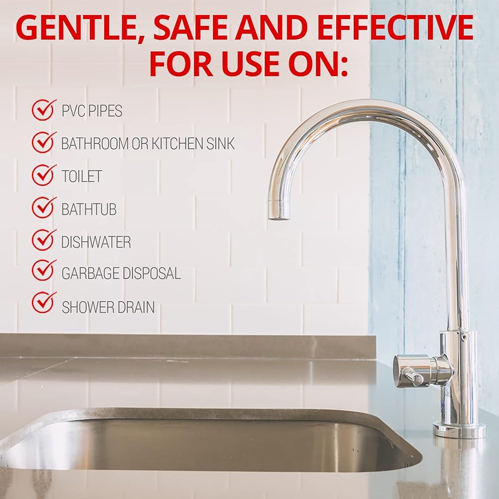 SAFE AND EFFECTIVE: This industrial strength treatment is gentle on your PVC pipes, bathroom or kitchen sink, toilet, bathtub, dishwasher, garbage disposal, and shower drain, but tough on the dirt and grime that causes clogs