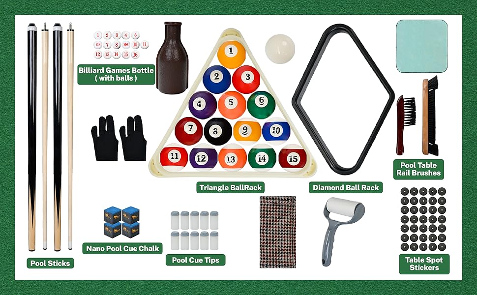 Premium All-in-One Set: A thoughtfully curated 93-piece premium pool table accessories set designed for players who value quality and completeness. Includes 16 regulation pool balls, 2 pool cues, 2 triangle racks, 4 premium nano chalk, cue tips, gloves, table point stickers, and a full cue & table cleaning set—everything needed for a refined home billiards setup.