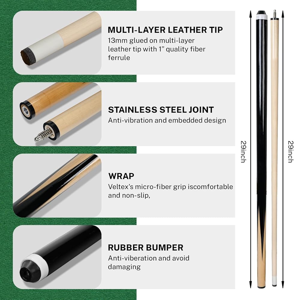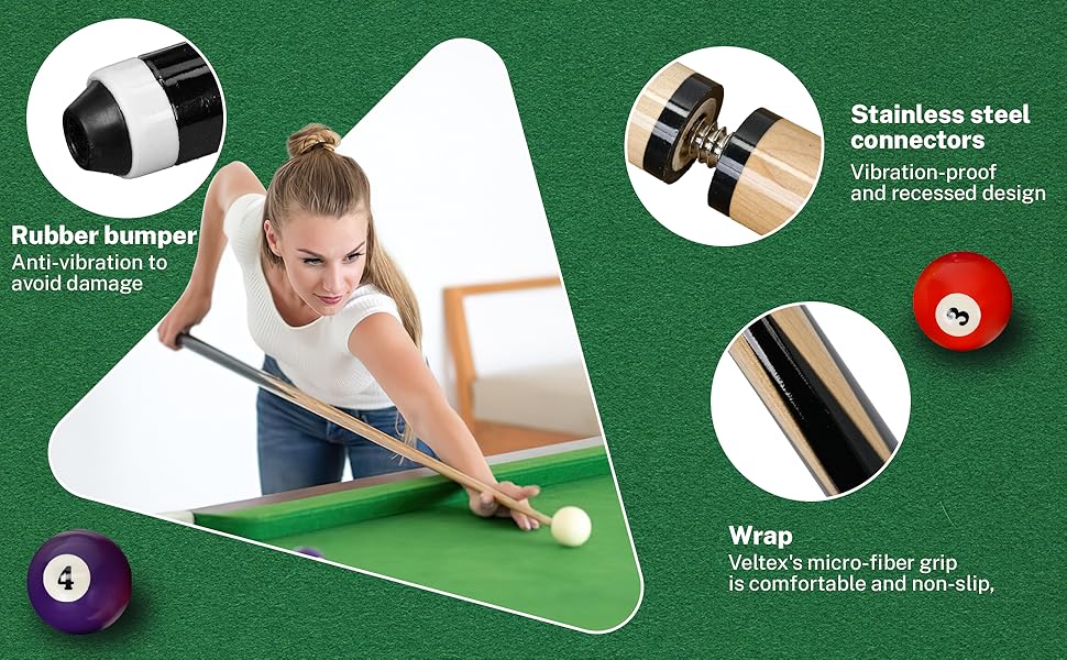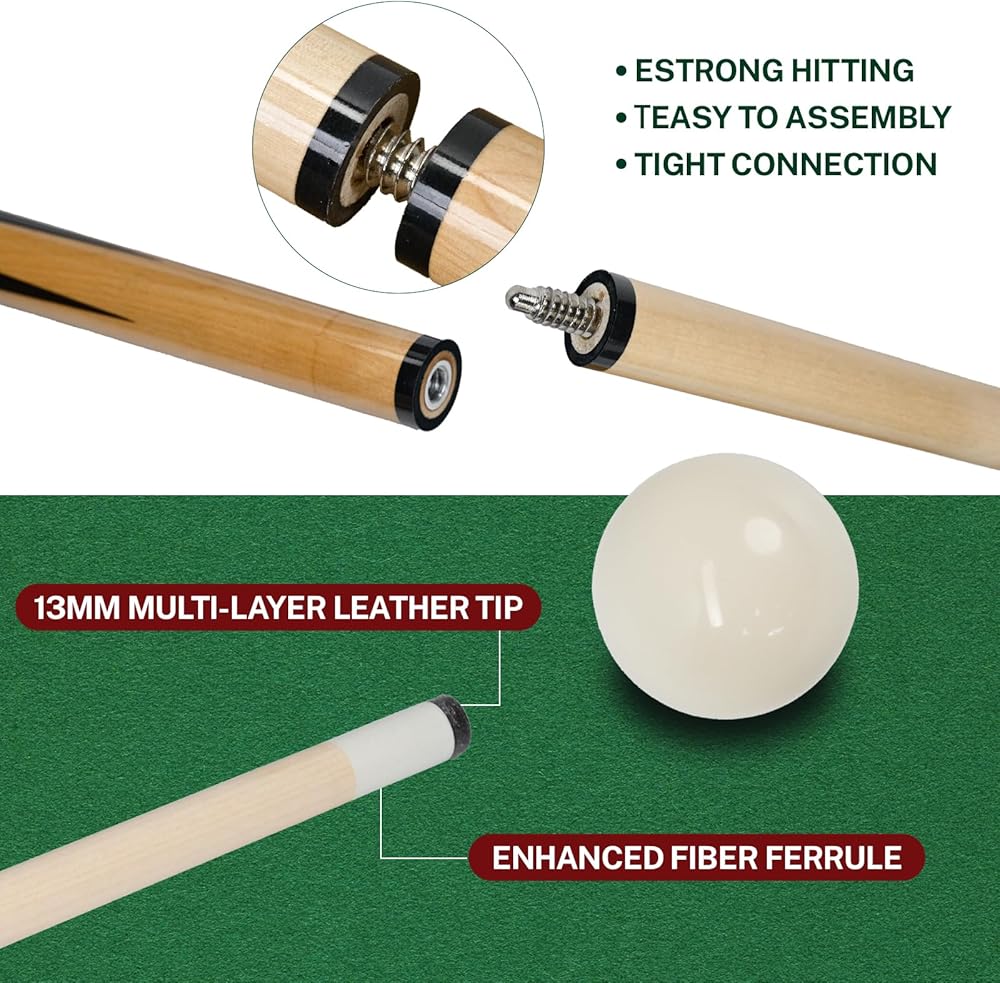 Regulation Size, Polished Feel: Built to standard specifications, the 2-1/4” billiard balls (approx. 6 oz) provide consistent roll and rebound, while the 58” pool cues offer a comfortable, balanced feel. Ideal for relaxed home play, skill practice, and friendly competition in game rooms or home bars.