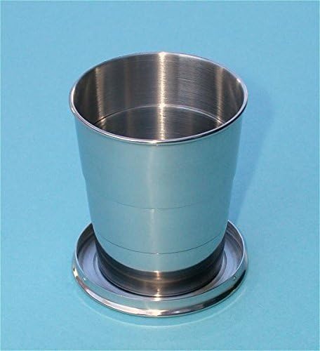 This high quality polished stainless steel collapsible pocket drinking cup is designed for use on-the-go where conventional drinking vessels would be too bulky or fragile. The 5 oz. collapsible cup fits easily into a purse or bag and the center of the cup has extra space for pills or medication. The Large 5 oz. Stainless Steel Collapsible Cup has sufficient volume to enjoy any beverage. The large cup has a stainless steel cover and comes in a genuine leather zippered case. The Large 5 oz. Collapsible Cup is 2 inches (64 mm) in diameter, 1 5/16 inches (34 mm) thick, and weighs only 4.9 ounces (139 grams). Including the leather case, the Large Collapsible Cup measures 2 15/16 inches (75 mm) in diameter, 1 13/16 inches (46 mm) thick, and weighs 6 ounces (170 grams).