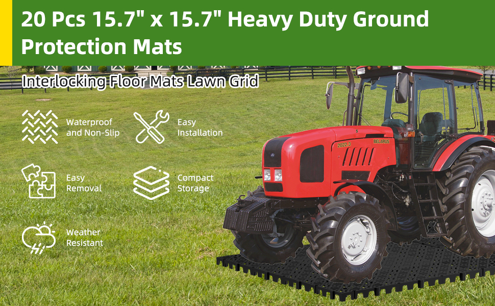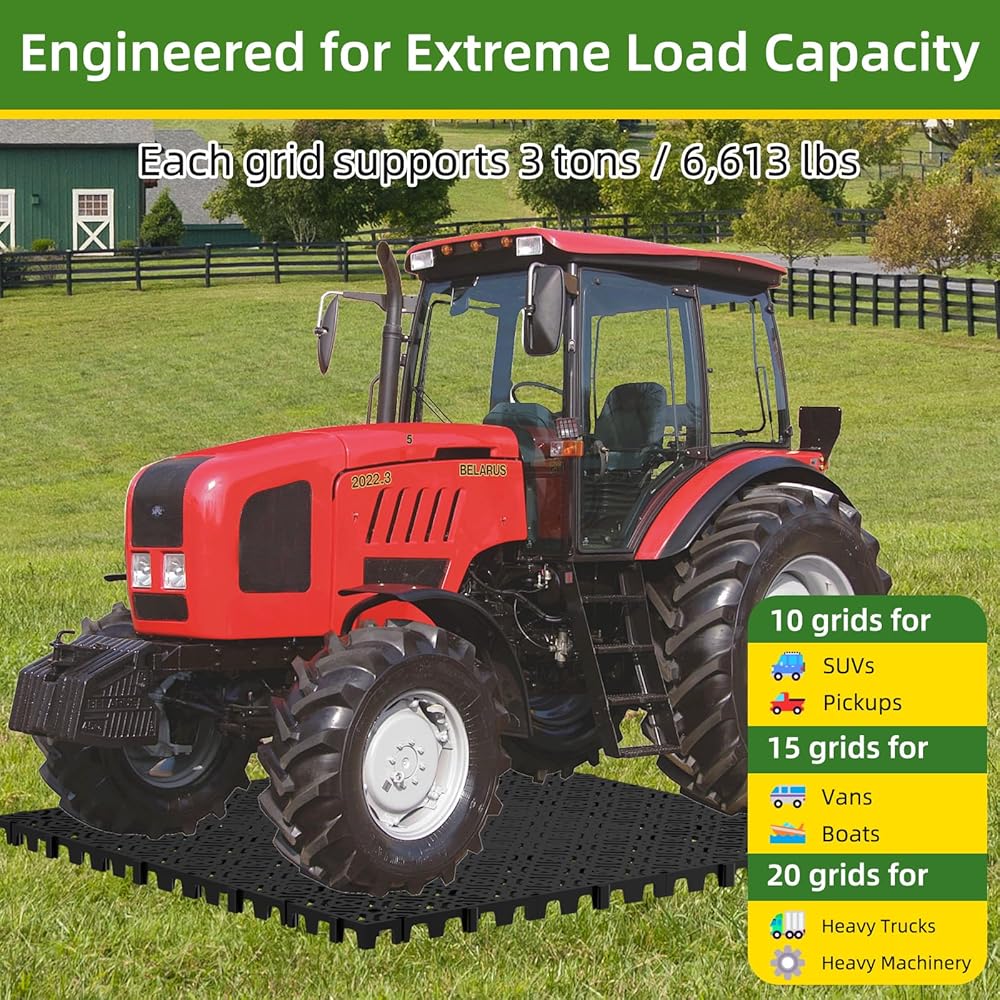 Built for Heavy Loads: Each 15.7" x 15.7" ground protection mat supports up to 6613 lb, and multiple mats combined easily handle trucks, RVs, trailers and other heavy vehicles. Create temporary parking areas, event venues or access roads without pouring concrete or asphalt. Just lay them down and drive on
