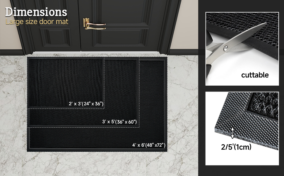 Customized Size & Shape - W3' x L5'(36" x 60"), 1/4" Thick. This front door rug is cuttable without any pieces loose, suitable for all kinds of corner or door shape as you want.