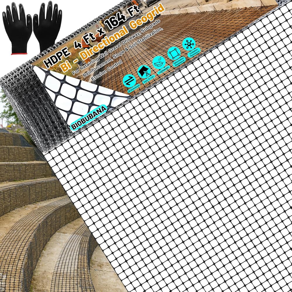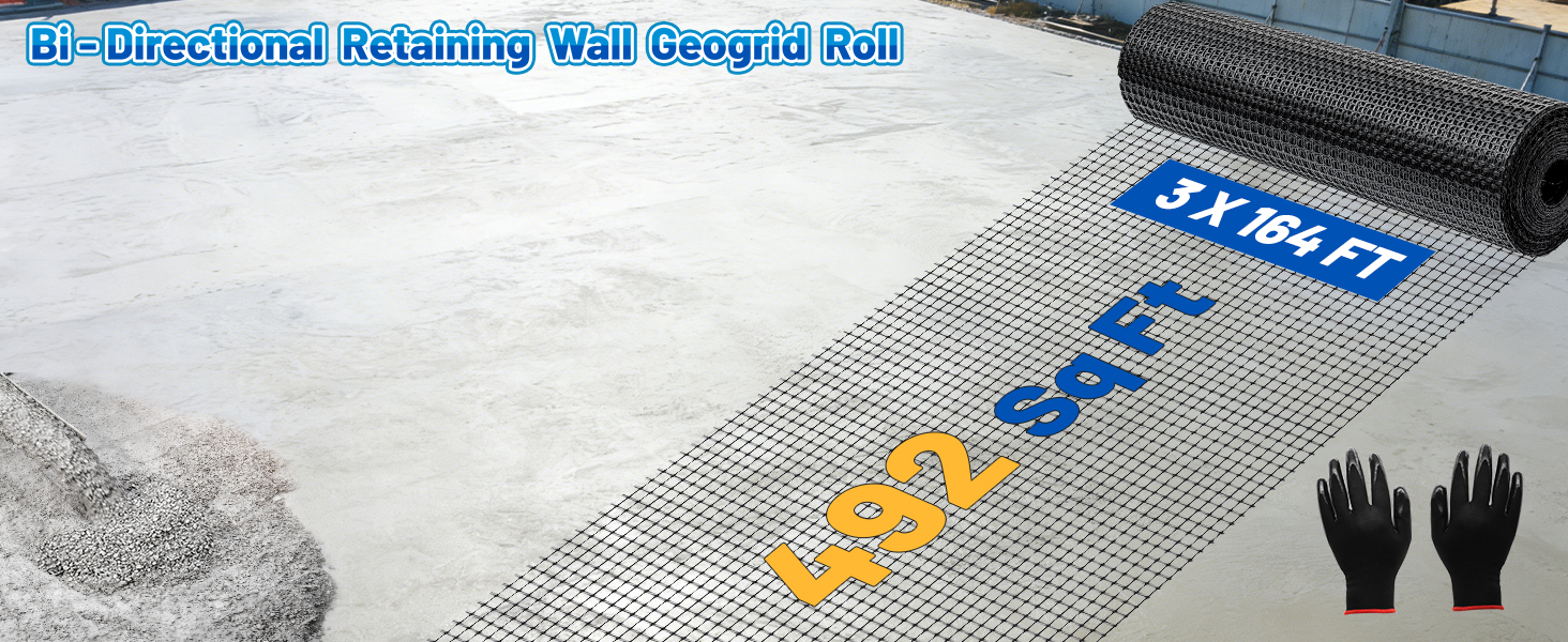 • Geogrid for Retaining Wall: This set includes a 3ft x 164ft geogrid and a pair of gloves. The geogrid roll evenly distribute loads to reduce soil deformation, prevent settlement, and enhance structural stability. It is perfect for subgrade, soil reinforcement, retaining walls, and slope stabilization projects