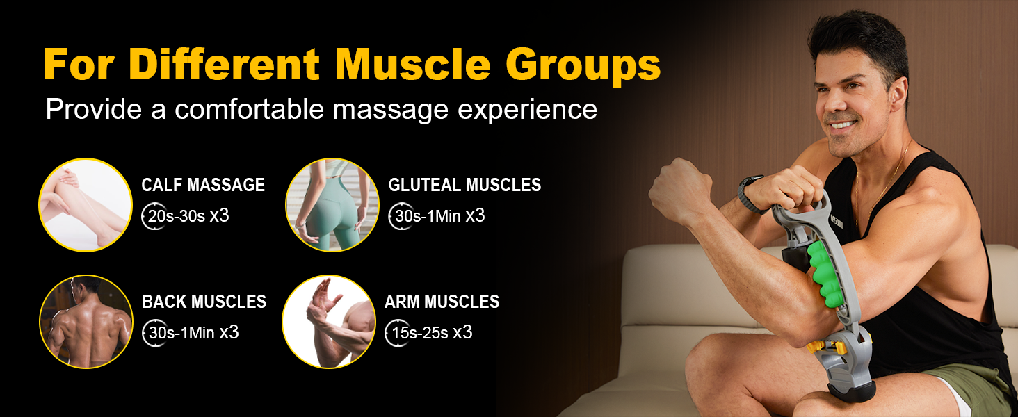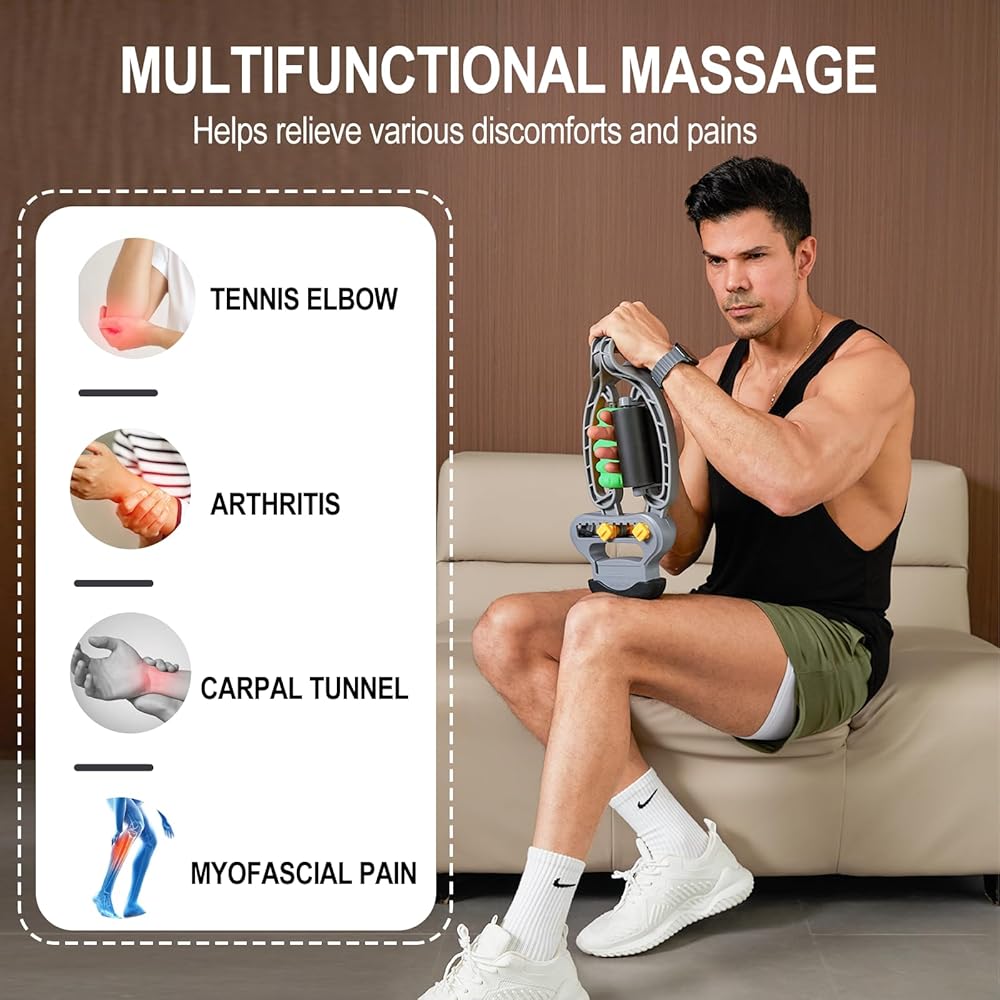 ➤【Multifunction Arm Massager】The elbow massager is expertly designed to provide targeted relief for individuals suffering from conditions such as tennis elbow and golfer's elbow. Detachable & adjustable fascia rollers can easily and effectively rotate and massage every part of the body (forearms, hands, wrists, legs and feet). Wrist massager help you relax muscles, release tight calves after exercise, relieve pain and discomfort after tennis elbow and golf. Simple trigger point activates myofascial release!
