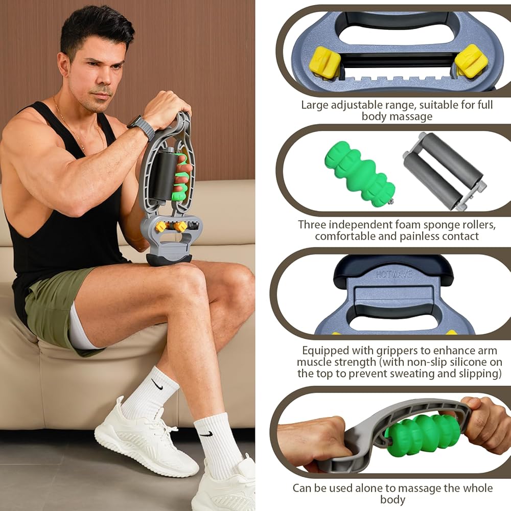 ➤【Ergonomic and Durable Design】 HOTWAVE arm massager boasts an ergonomic design that comfortably fits the contours of the arm and leg. Tennis elbow relief massagers can be easily adjusted to fit the width and apply pressure to different body parts, helping you enjoy deep muscle massage and helping relieve sore muscles. You have more control over it with the string on the handle, and you can disassemble the yellow side and use it like a massage stick. Forearm roller expands the scope of its use. The top grip acts as an arm strength trainer to help you recover and build arm strength.