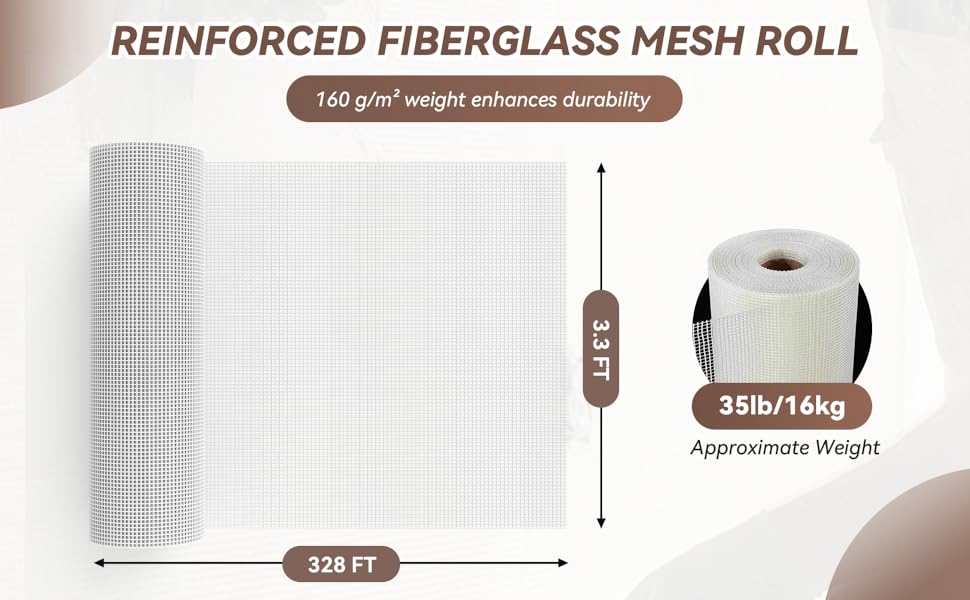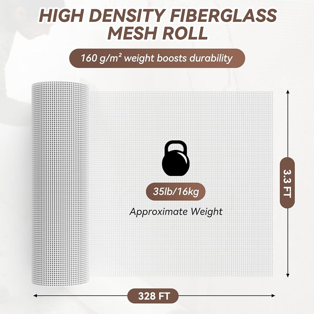 📐【Material & Specifications】: This fiberglass mesh roll measures 3.3 x 328 ft (1x100m). It features a 4x4mm grid and a weight of 160g/m². The mesh is constructed from woven fiberglass with a polymer coating. (Product is not self-adhesive; slight edge fraying may occur.)