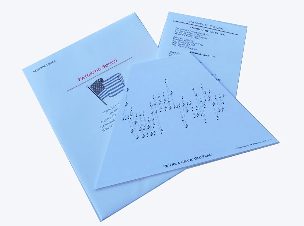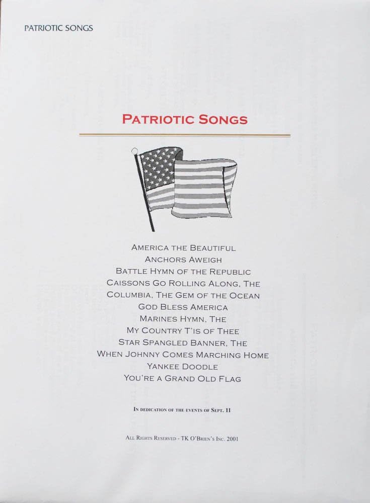 Song List: America the Beautiful, Anchors Aweigh, Battle Hymn of the Republic, The Caisson Go Rolling Along, Columbia The Gem of the Ocean, God Bless America, The Marines Hymn, My Country T'is of Thee, Star Spangled Banner, When Johnny Comes Marching Home, Yankee Doodle, You're a Grand Old Flag