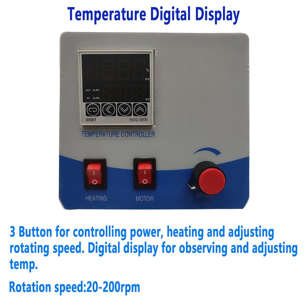 Digital Display: 3 Button for controlling power, heating and adjusting rotating speed. Digital display for observing and adjusting temp