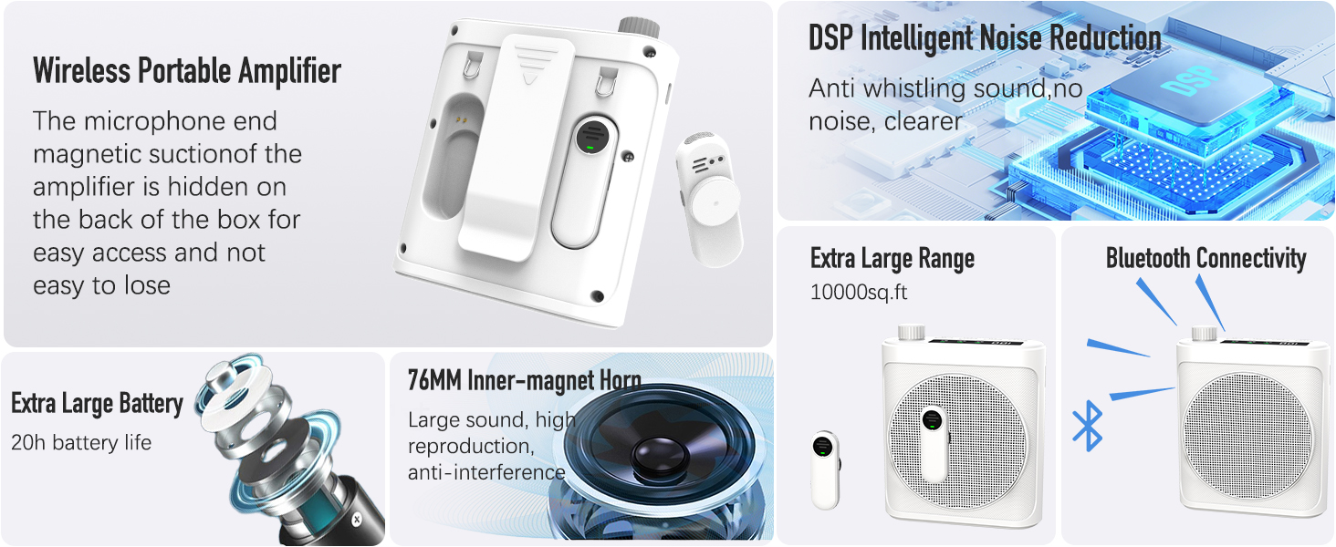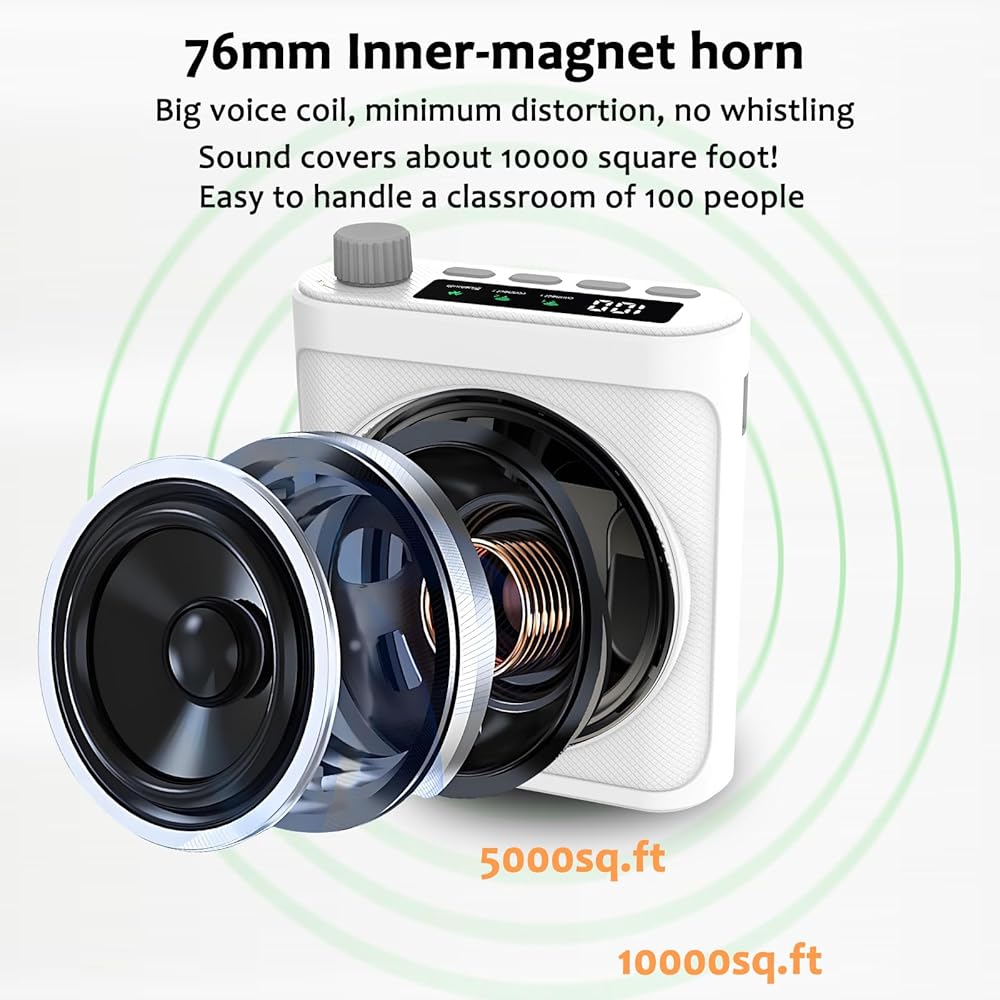 Original Clear Sound: This portable voice amplifier has 76MM anti-interference Inner-magnet horn effectively amplifies your voice and protects your throat, allowing up to 100 students to hear you clearly. Built-in DSP noise reduction chip to achieve no noise feedback, no whistling, output clear and soft sound