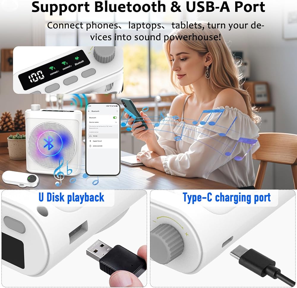 Widely Compatible: This Bluetooth voice amplifier also supports U disk, easily connect to your cell phone/iPad/PC via Bluetooth for a hassle-free audio experience. Great for teaching, training, coacher, tour guide, shopping mall, speech, outdoor singing, etc.