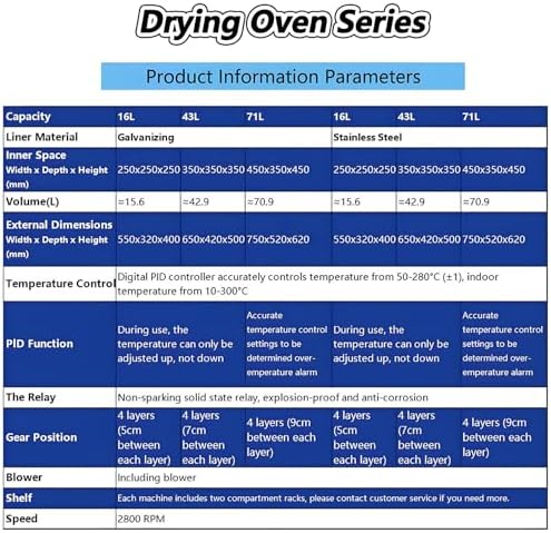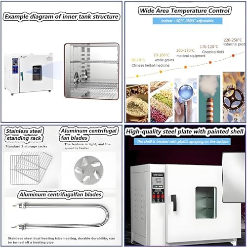 High-Quality Materials: This Electric Heating Constant Temperature Blast Drying Oven is made from durable Galvanized Sheet with an Electrostatic Sprayed Exterior for enhanced Corrosion Resistance. Key features include an Over-Temperature Alarm, Self-Tuning functionality, and Temperature Calibration Timing, ensuring reliable performance for various drying applications.