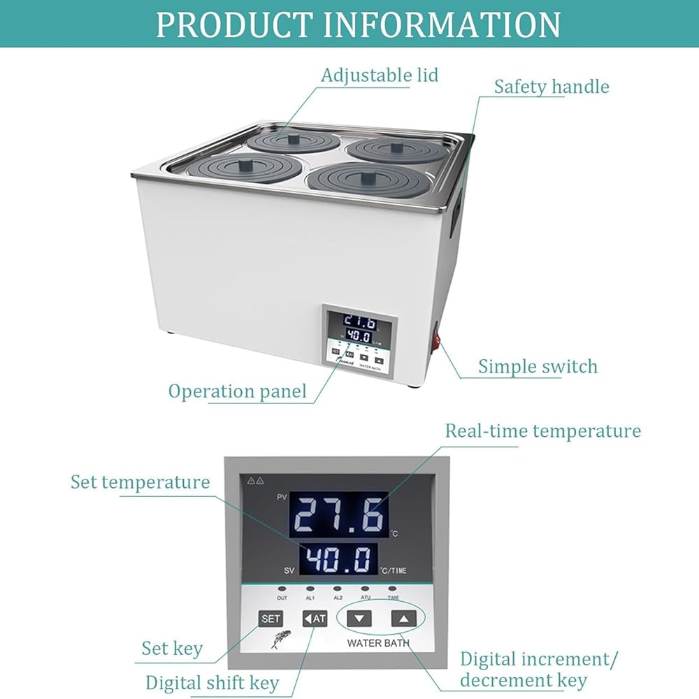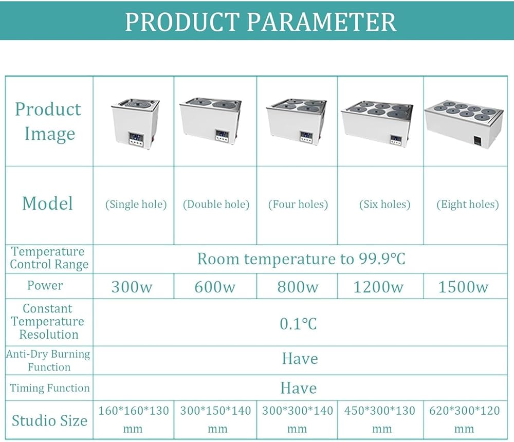 Elevate your laboratory experience with our premium Lab Water Bath, expertly crafted to fulfill your water heating requirements with precision and reliability. This water bath is an indispensable tool for various applications, including sample preparation, temperature control experiments, and biological research. **Key Features:** - **Digital Temperature Display:** Easily monitor and control the temperature with a user-friendly display that shows both the current temperature and the setpoint, ensuring accuracy in your experiments. - **Durable Construction:** Made from high-quality 304 stainless steel, our water bath is designed to resist rust and corrosion, providing long-lasting performance. - **Optimal Performance:** For best results, we recommend using distilled water, which enhances the efficiency and longevity of the unit. **Specifications:** - **Temperature Range:** Room temperature to 99.9°C - **Temperature Increments:** 0.1°C for precise adjustments - **Timer Function:** Set from 1 minute to 24 hours for versatile applications - **Voltage:** 110V, 60 Hz - **Inner Wall Material:** Stainless steel for superior durability **Available Models to Suit Your Needs:** - **1 Hole:** Heating power of 300W, dimensions 160*160*130mm - **2 Holes:** Heating power of 600W, dimensions 300*150*140mm - **4 Holes:** Heating power of 800W, dimensions 300*300*140mm - **6 Holes:** Heating power of 1200W, dimensions 450*300*130mm - **8 Holes:** Heating power of 1500W, dimensions 620*300*120mm **Package Includes:** - 1 x Digital Lab Water Bath - 1 x Power Cord - 1 x User Manual Transform your laboratory processes with our Lab Water Bath, a reliable solution that combines efficiency and precision for all your heating needs. Make the smart choice for your experiments today!