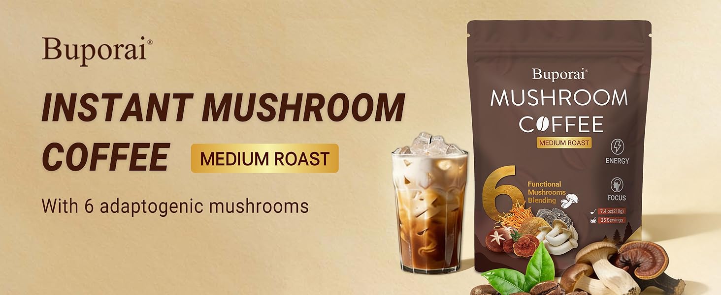 MUSHROOMS AND COFFEE'S POWERFUL COMBINATION: 6 types of mushrooms are blended with medium-roast Arabica instant coffee powder, allowing you to enjoy a delicious, smooth-tasting coffee. It also helps boost immunity, regulate the digestive system, enhance energy and focus, and provide sustained vitality when consumed daily
