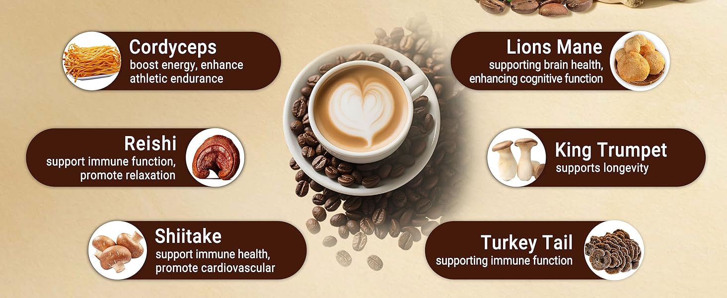 6 ADAPTOGENIC MUSHROOMS: Mushrooms have been used worldwide for centuries, and our mushroom coffee contains 6 functional mushrooms, including Cordyceps, Lions Mane, Reishi, Shiitake, Turkey Tail, and King Trumpet. They provide a variety of nutrients
