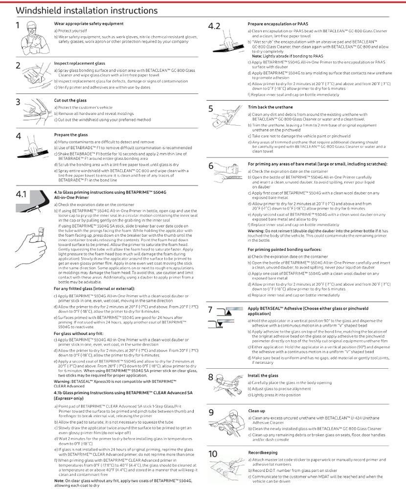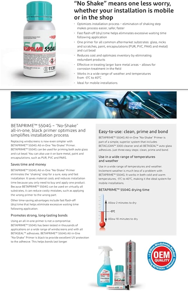 Dow/Dupont Urethane Adhesive Betaseal Xpress 30 1 Case - 10 Cartridges 10.5oz (300ml each)with 8 Nozzles - 1 Bottle of 5504G (4.2oz) Primer Buyer Note Urethane Requires Primer to Glass Application Urethane is not primerless - Urethane needs primer to adhere to glass fit band Minimum drive away:30 Minutes in temperatures as low as 0 ̊F Sealant type: advanced-cure urethane Exclusive RPM adhesive technology High modulus Non-conductive Formulated for all standard glass replacements Improved formula is easy to use with superior decking and short cut-off string Meets all OEM requirements BETASEAL Xpress30 – 30 minute minimum drive away as low as 0°F Dow Automotive's new BETASEAL Xpress30 High Modulus/Non-Conductive Urethane Adhesive delivers a 30-minute minimum drive away in temperatures as low as 0°F This fast curing, high-strength adhesive employs Dow's Reinforced Polyisotropic Micronetworked technology (RPM). RPM features shorter crosslinks that create strong bonds quickly. This allows the car to be released to the owner as quickly as 30-minutes after application. BETASEAL Xpress30 is cold applied, but has excellent pumpability and is easy to tool. Use exclusively with BETAPRIME 5504G All-in-One Primer as part of a simple clean, prime, bond process. It also is ideal for cold weather applications because BETASEAL Xpress30 offers 30-minute minimum drive away in temperatures as low as 0°F and BETAPRIME 5504G has a 6-minute flash off time in temperatures below 20°F (just two minutes above 20°F). Buyer Note: This Product is a Professional Use Item and should only be used by Certified Auto Glass Technicians This Product Requires a 26 to1 Thrust Ratio Professional Caulk Gun to Dispense or Better. Buyers Agree to Hold Harmless Seller and Dupont Industires for Use of this Professional Product Customers choosing to use this product without certification and or knowledge of it's use and cure times do so at there own risk.