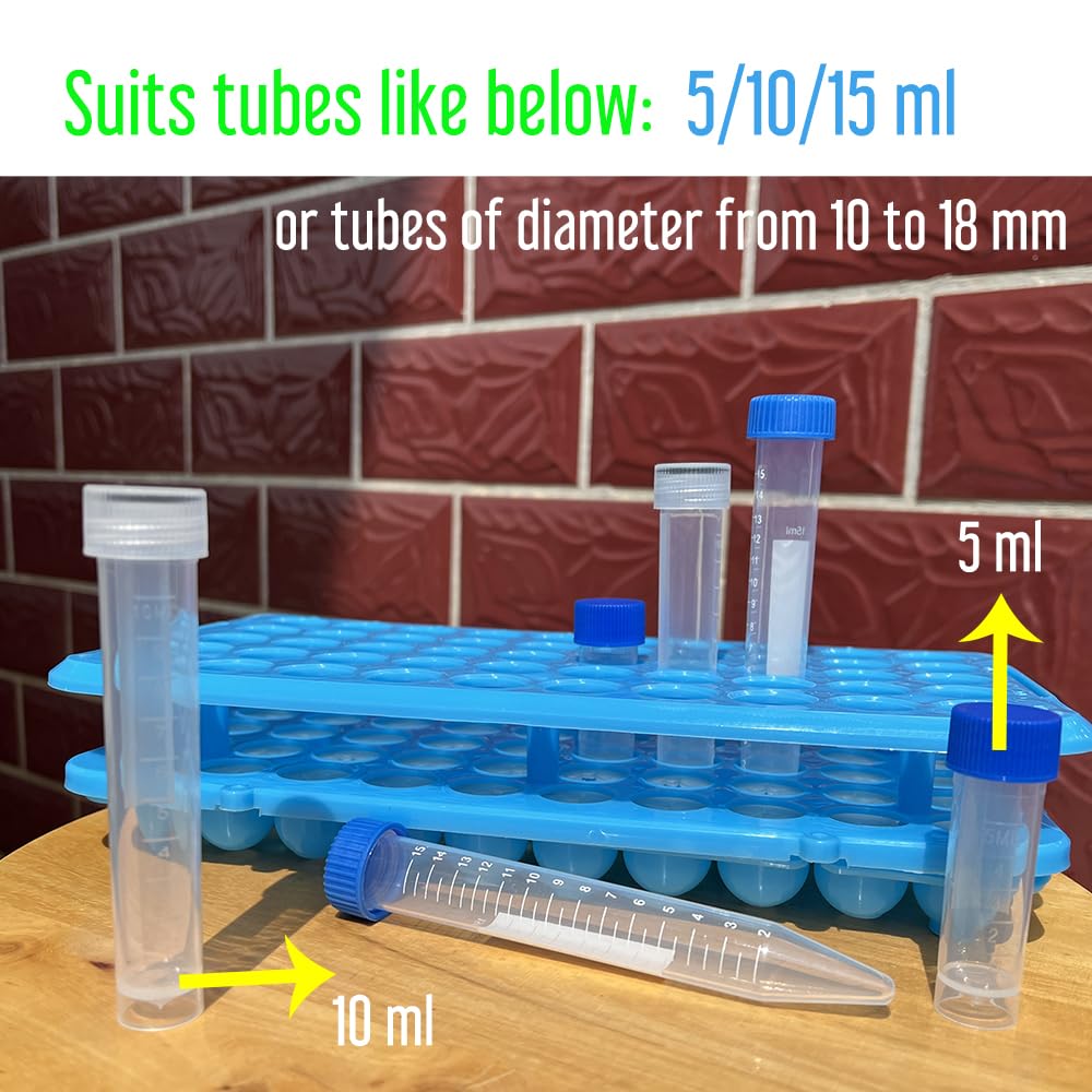 Detachable centrifuge tube rack size: LxWxH 9.8x5.1x2 inches, Hole dia: 0.72 inches. A way to help you count and store vials, 50 hole vial box to store 15ml, 10ml, 5ml centrifuge tubes. Please browse picture for better size reference, and make sure you purchase a right size box for your tubes. Package includes 1 box WITHOUT tubes.