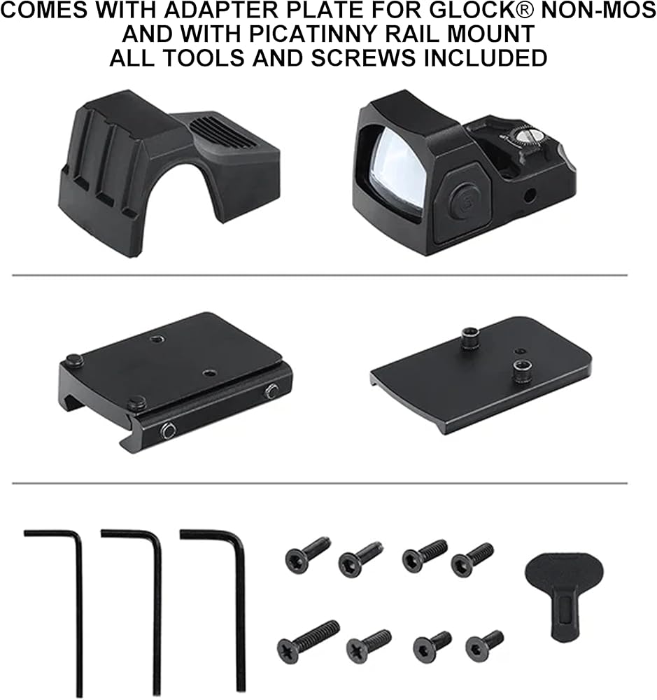 • 3-in-1 Mounting System: Fits GLOCK MOS, standard GLOCK slides (non-MOS), and any 21mm Picatinny rail using the included mounts.