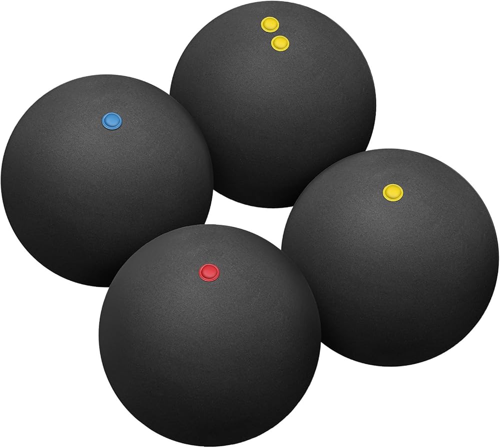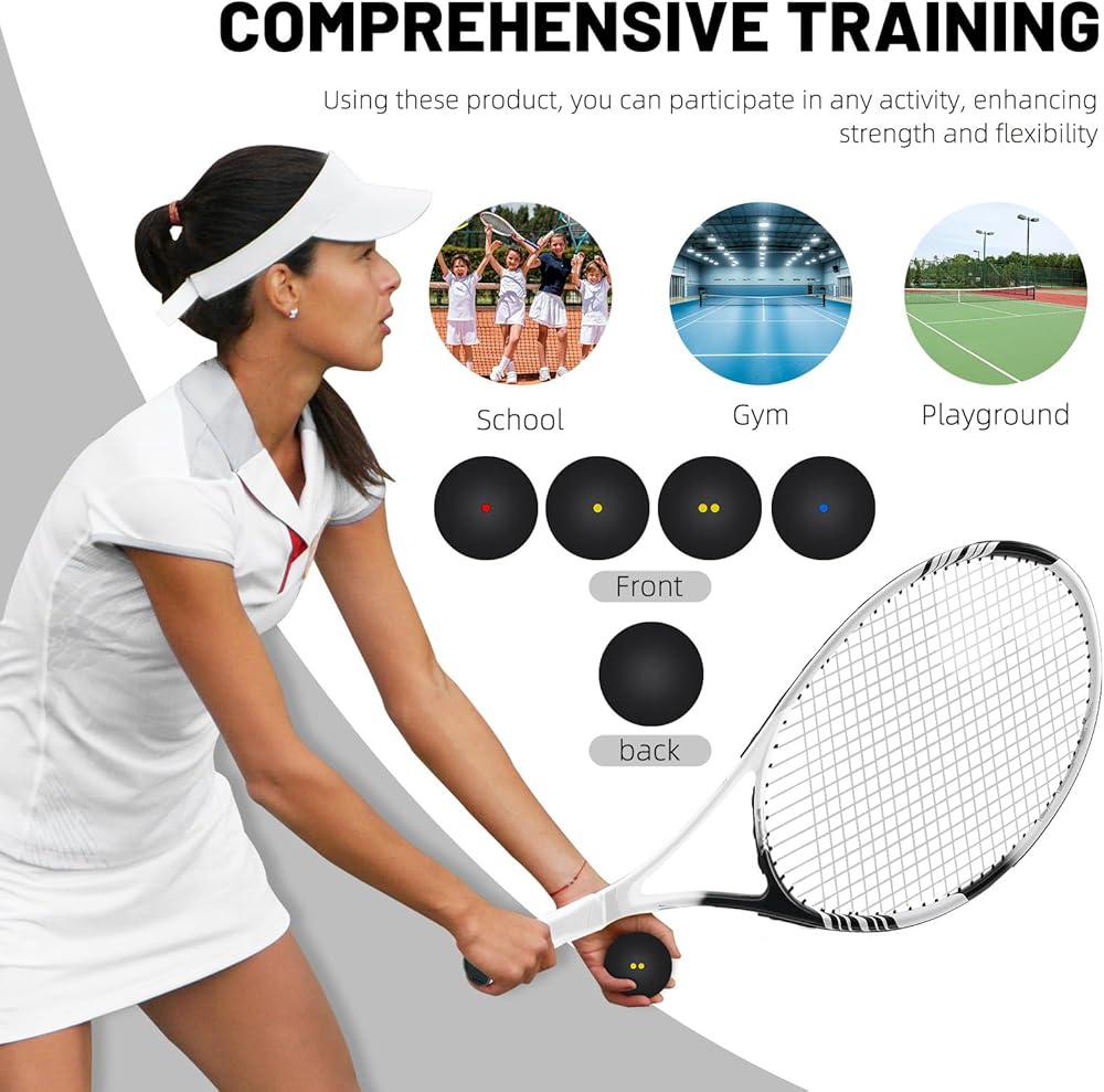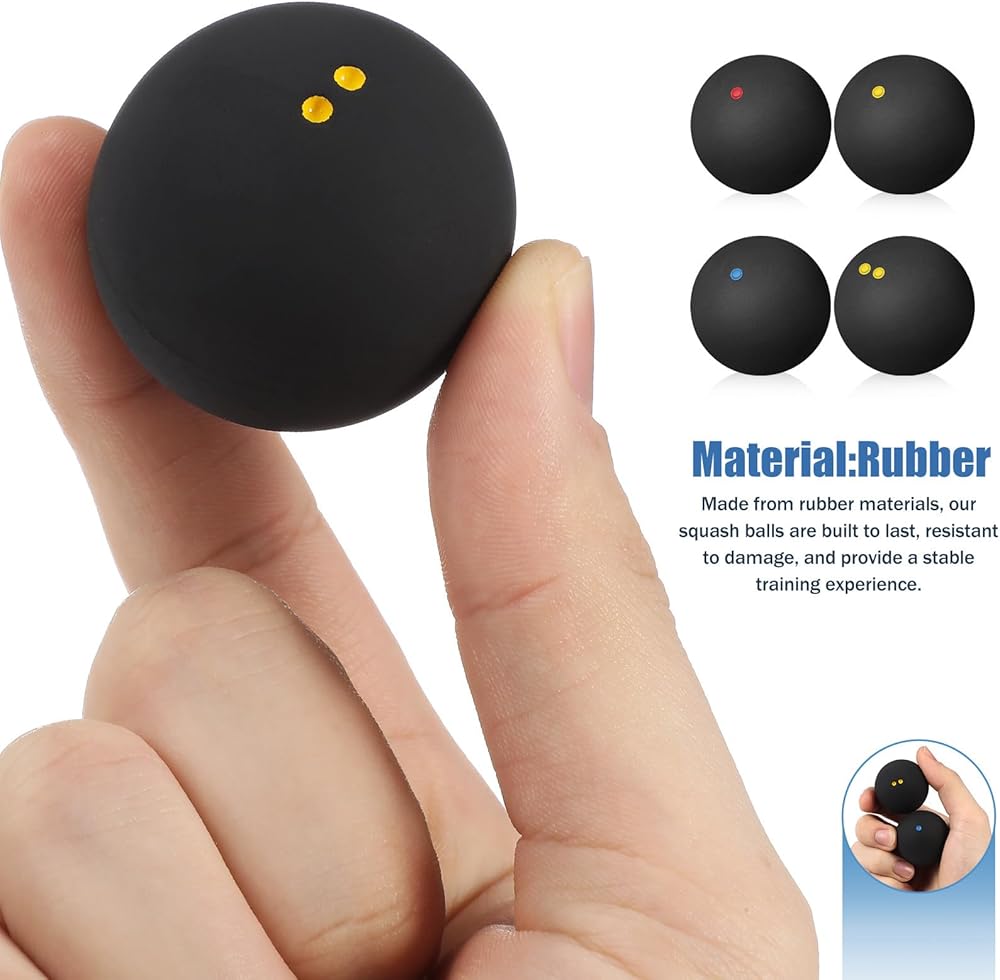 These 4 pcs squash balls are designed for effective training and practice in indoor racket sports Made from rubber, each ball measures approximately 1.53 inches in diameter, providing consistent high elasticity and bounce for various skill levels The set includes four balls with different dot markings (single yellow, single blue, single red, double yellow) to suit diverse training needs and playing conditions