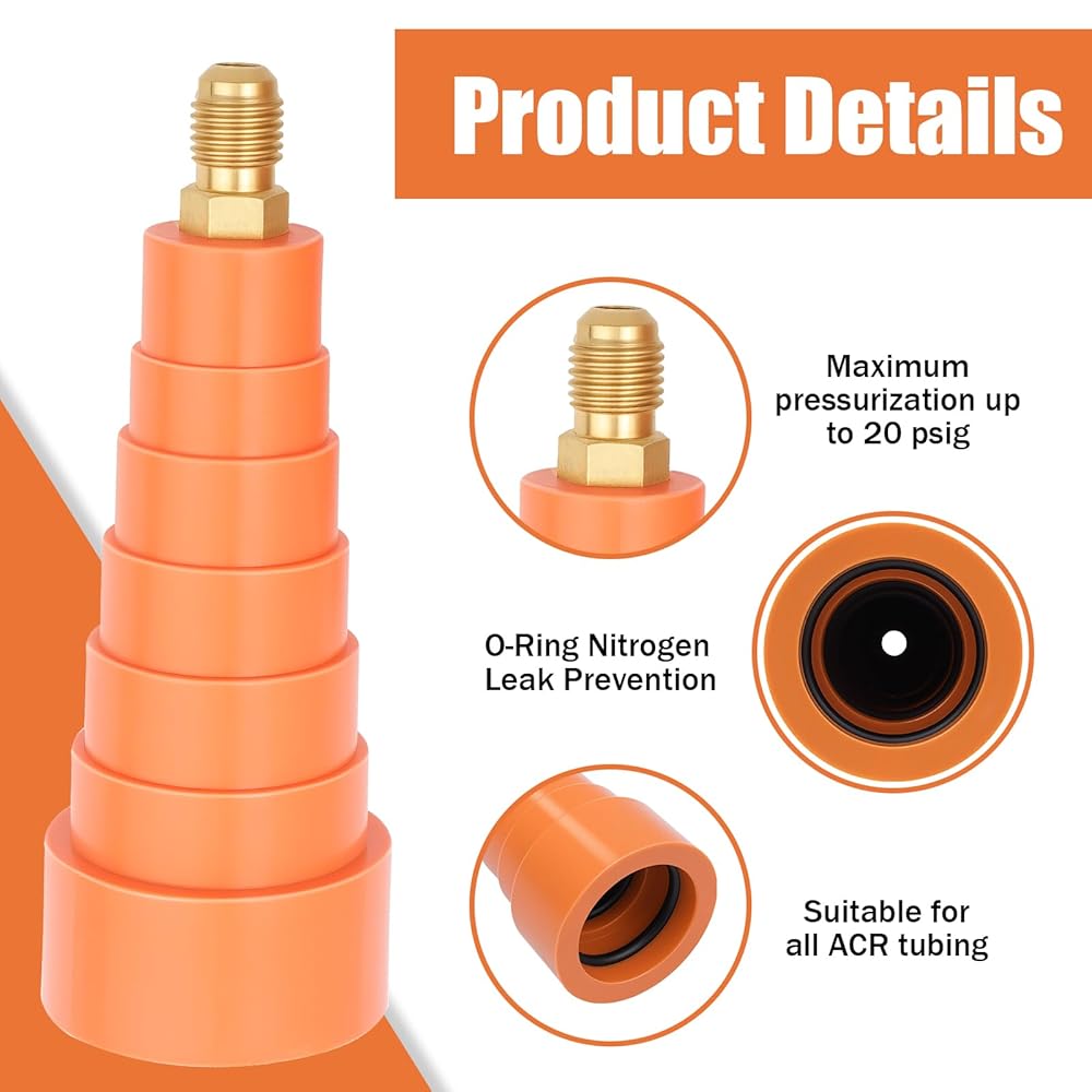 Multi-Size Compatibility: Fits a wide range of ACR tubing sizes including 3/8", 1/2", 5/8", 3/4", 7/8", and 1-1/8" OD, making it a versatile nitrogen purge tool for various HVAC applications.