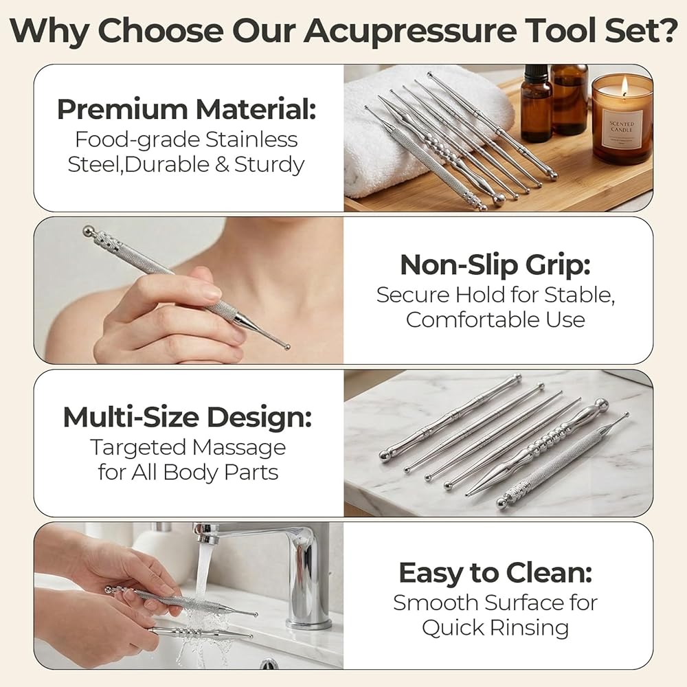 【Premium Stainless Steel】 Crafted from food-grade stainless steel, these reflexology tools ensure durability, safety, and effortless cleaning for long-lasting hygiene and performance
