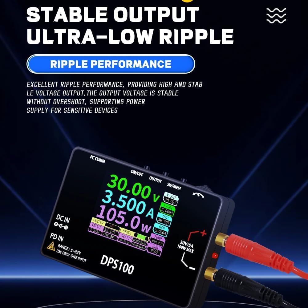 Built-in TYPE-C and DC interfaces, supporting PD/QC/DC input respectively; supports DC 5~32V wide voltage power input, output voltage adjustable from 0V (0 to (VIN-1)V), constant current adjustable from 0A (0-5A); low ripple, high efficiency, supports up to 100W output.