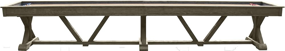 The Brazos River shuffleboards are part of the Fairfield Collection of game tables by Playcraft. The Brazos trestle leg design and hand finishing is inspired by old world styling and craftsmanship. The 12' has two legs. The 14' and 16' have three legs. Whether your choice is a timeless Chestnut or Espresso finish, or a distressed weathered Gray, Black, Barn, or Brown that appears to have been reclaimed from a century old countryside barn, the Brazos is certain to make a statement. More than just beautiful furniture, the high quality materials and construction will ensure many years of high quality shuffleboard with family and friends. Also available in matching 8 slate pool tables. . Assembled dimensions and weights; 12' 145\" L x 33\" W x 32\" H / 575 lbs 14' 169\" L x 33\" W x 32\" H / 675 lbs 16' 193\" L x 33\" W x 32\" H / 790 lbs. Assembly Required. Weathered finishes are achieved by applying semi-transparent stains over a base color of brown on natural wood to create an overtone color range. Finished wood that has naturally weathered outdoors will have varying degrees of intensity within the color range, however, no two boards will be the same. Grain density and lighting will also be a factor on how color is viewed depending upon the grain direction. This effect is by design and the images presented depict the overtone range for each weather color offered. The unique characteristics in grain patterns and color of natural wood, combined with the hand staining process, achieves the old weathered wood design concept of Playcraft weathered game tables. Color variations within an item and between items will exist and should be anticipated.