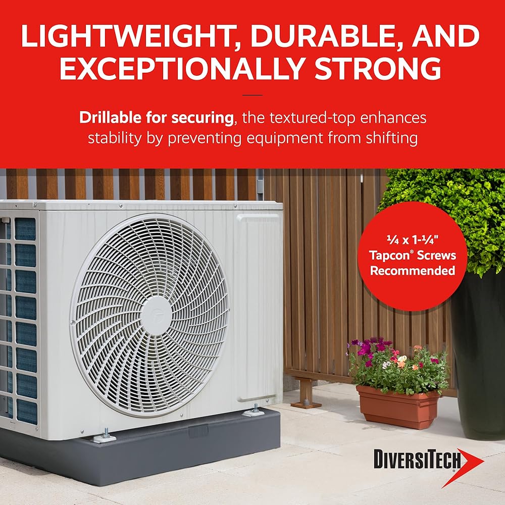 Ensure your outdoor equipment is safe and secure with the Diversitech E Lite Plastic Equipment Pad. This durable equipment pad is the perfect mounting base for HVAC outdoor units and other outdoor equipment. Made of injection molded polypropylene, this lightweight pad is easy to maneuver but rugged for long-lasting use even in extreme weather. The drillable design makes it easy to secure equipment to the pad and the subtle top texture helps prevent equipment from shifting. The E Lite's optimized rib pattern spreads the load evenly and ensures pad strength and stability on soil and gravel terrain. Measuring 36" x 36" x 2", this pad is the perfect size for your outdoor equipment. Provide stable support for your HVAC equipment with the Diversitech E Lite Plastic Equipment Pad! DiversiTech Corporation is North America's largest manufacturer of equipment pads and a leading manufacturer and supplier of components and related products for multiple industries, including: HVACR, electrical, consumer hardware retail, electrical utility, automotive retail and pool and spa channel. We offer high-quality, innovative and advanced products that save time on installations. Combining exceptional customer support with a full line of HVAC parts and accessories, we provide the resources and tools necessary to meet any customer needs.