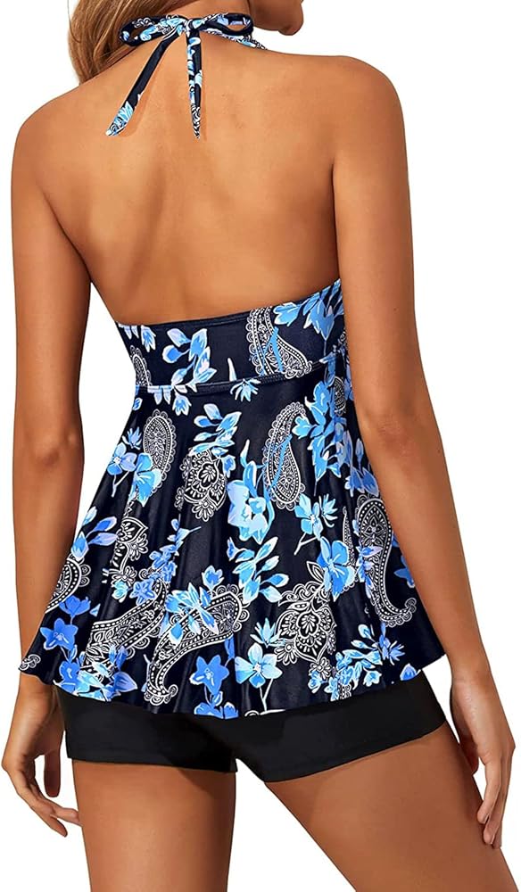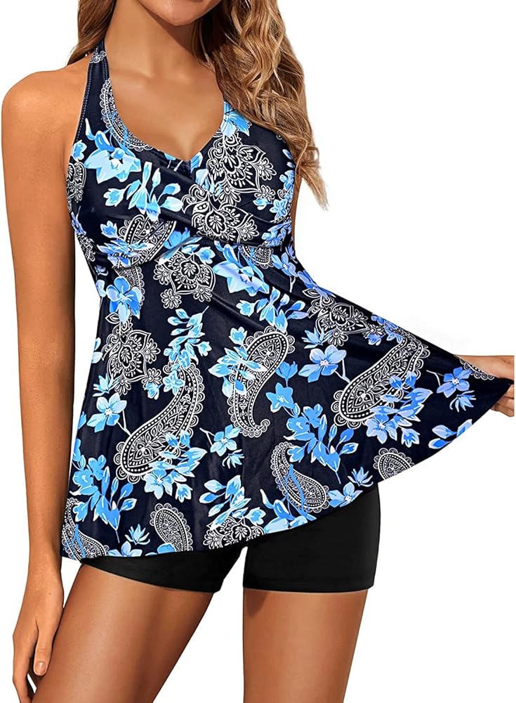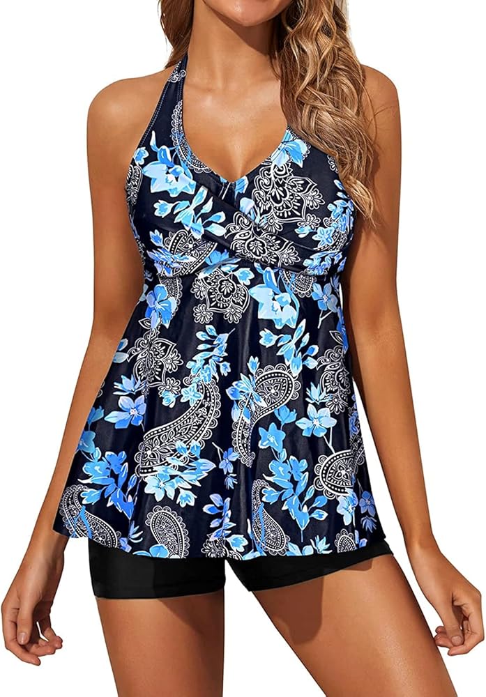 2 piece tankini bathing suits for women: Swim top + boy shorts bottom. Tankini tops with a halter V-neck offer support and shape