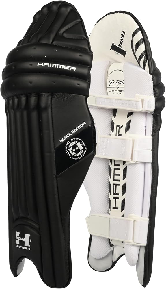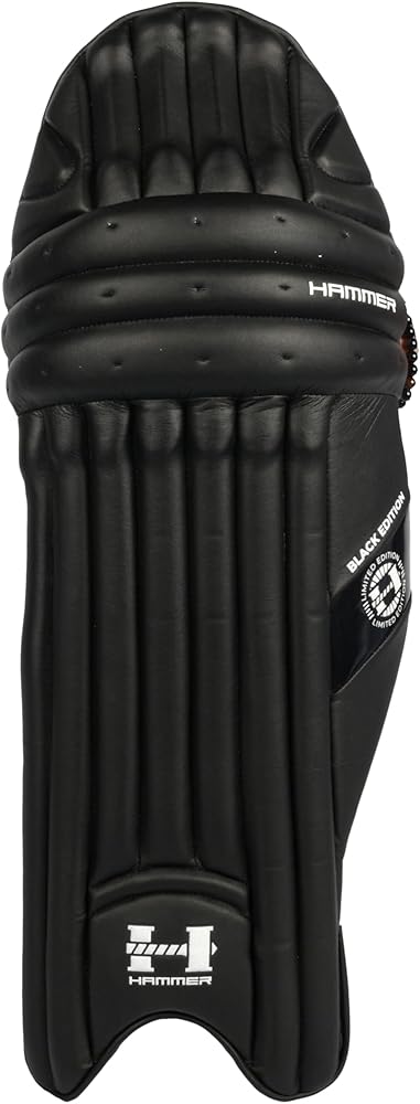 The Hammer Black Edition Batting Pads combine cutting-edge materials with thoughtful design for superior protection without sacrificing mobility. The HD EVA molding with cane backing delivers exceptional impact resistance while the innovative Litefoam knee roll provides flexibility and durability for extended innings. Key features: HD EVA molding foam with cane backing in the front and reinforced top hat area offer superior protection against fast deliveries .Three-section Lite foam knee roll provides better shape retention and protection compared to traditional cotton while reducing weight. Three-strap hook and loop system with hygroscopic backing material to absorb sweat and prevent slippage. Foam-padded areas below straps, tri-flex shin bolsters with air mesh facing, and strategically designed back with hard plastic cup and HD foam sections.High-quality Korean PU exterior in navy with embossed branding throughout for a professional appearance.