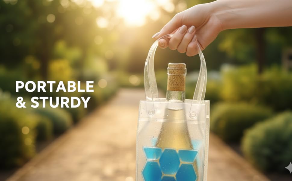 No Ice Cubes Needed – Built-in Gel Technology: Featuring an innovative hexagonal gel design that acts as a powerful cooling agent. Simply place the bag in the freezer for 1-2 hours before use. It keeps your wine or champagne perfectly chilled for hours without the mess of melting ice and water.