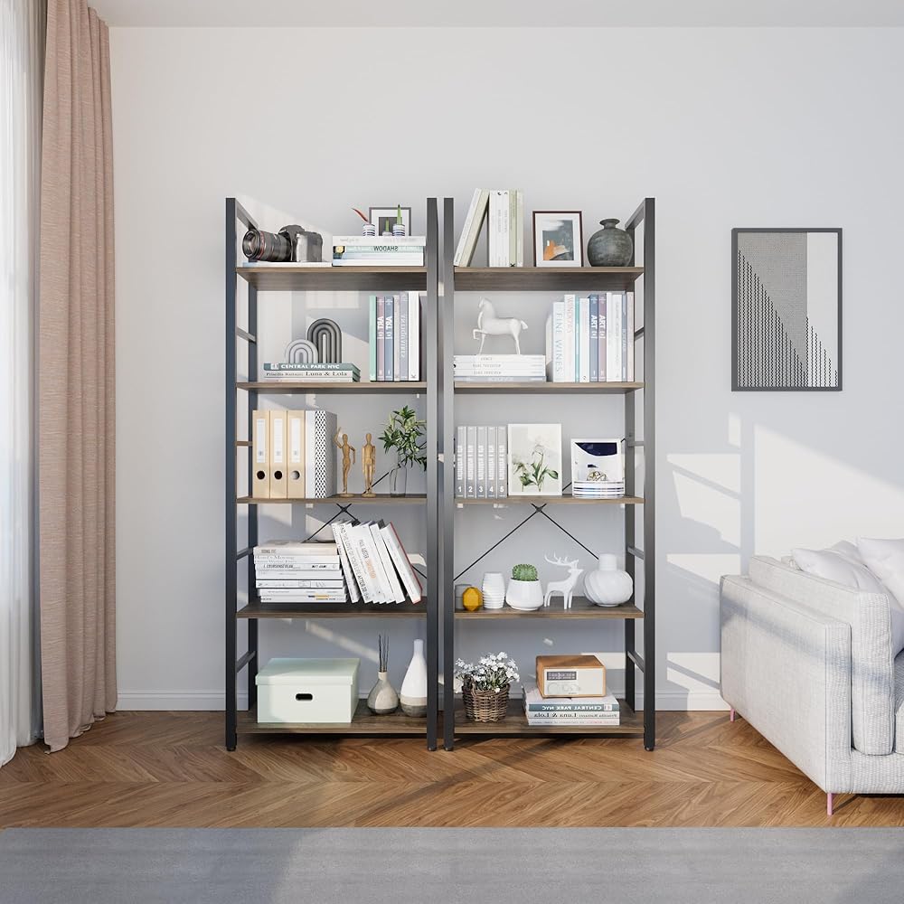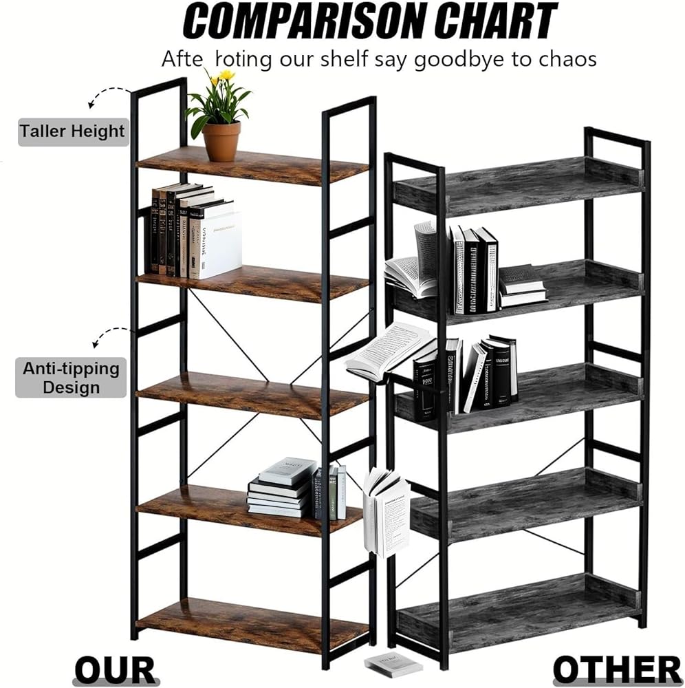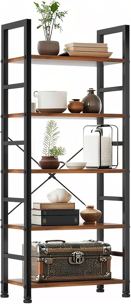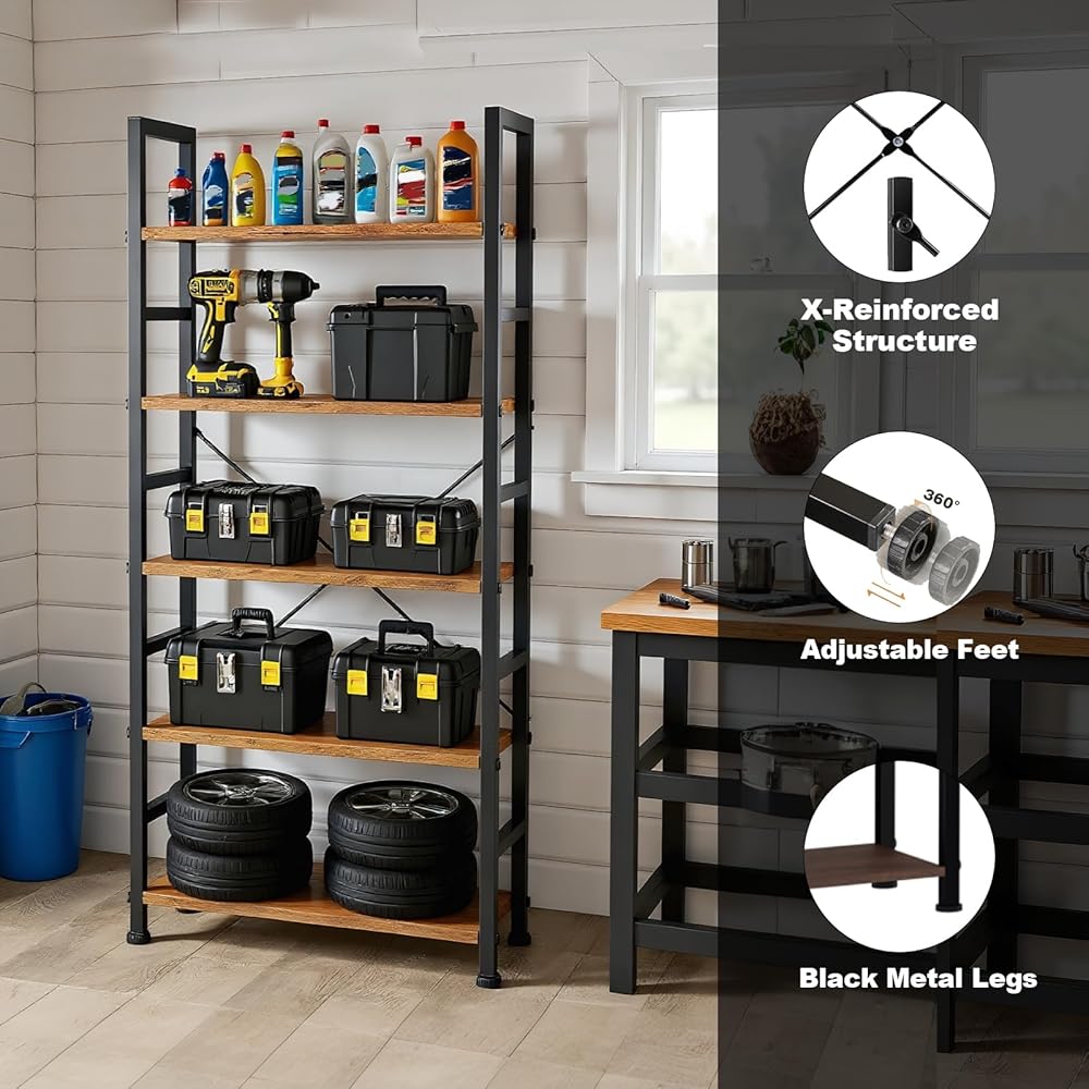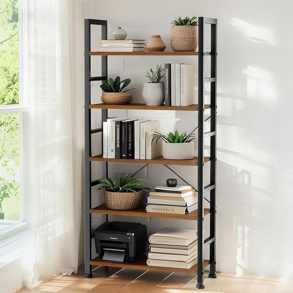 This impressive 5-tier bookshelf stands 62.2 inches tall and offers exceptional storage capacity for your home or office. The vintage-inspired design features a sturdy black metal frame combined with rich wood shelving that complements any décor style. Each shelf measures 13 inches in height, providing ample space for books, decorative items, storage bins, and more. With overall dimensions of 62.2" H x 23.62" W x 11.81" D, this bookcase maximizes vertical storage while maintaining a compact footprint. The high-quality wood boards feature a special surface treatment that is waterproof, stain-resistant, and anti-scratch, ensuring long-lasting beauty and durability. The X-reinforced structure on the back provides enhanced stability and prevents wobbling, safely supporting up to 30 lbs per shelf. Adjustable feet allow you to level the unit on uneven floors for a secure, stable setup. This versatile shelving unit works beautifully in bedrooms, living rooms, home offices, studies, or storage rooms, offering both functionality and style for organizing your space.