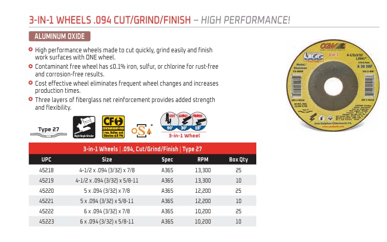 High performance wheels made to cut quickly, grind easily and finish work surfaces with ONE wheel.