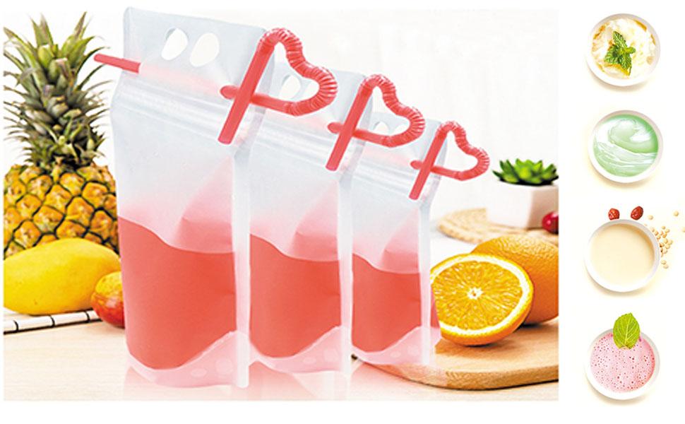 Food-grade Drink Bags: The drink pouches are made of non-toxic, BPA and Phthalate free materials. The drink bags material is safety for you, your family and your guests. Round corners for safety, The reclosable zip ensures easy opening and no leaking accidents