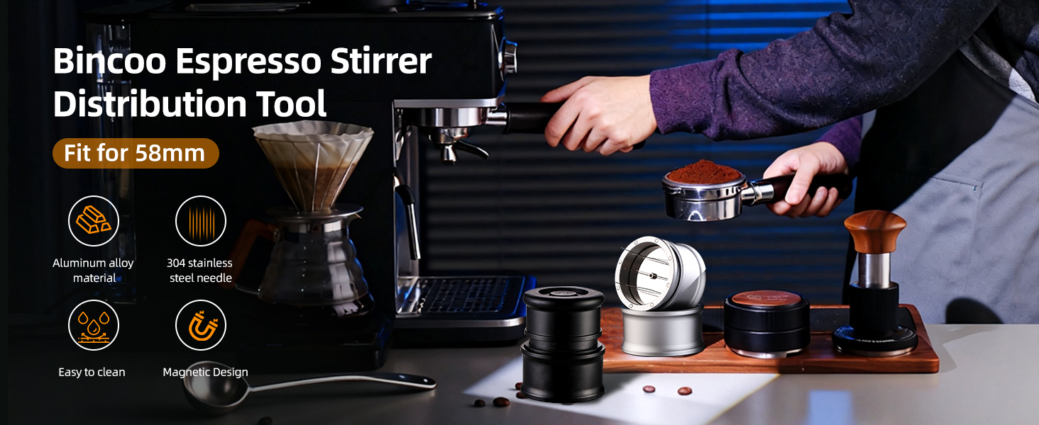 1. Effortless Rotating Espresso Distribution Tool for Home Use Bincoo espresso distribution tool makes home brewing simple. With a rotating design and 8 stainless steel needles, it quickly breaks up clumps and levels coffee grounds. This espresso stirrer tool helps home baristas achieve café‑quality shots without complicated techniques.