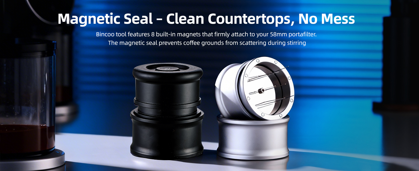 2. Magnetic Seal – Clean Countertops, No Mess Unlike basic coffee distributors, this Bincoo tool features 8 built‑in magnets that firmly attach to your 58mm portafilter. The magnetic seal prevents coffee grounds from scattering during stirring—keeping your home coffee station tidy. A smart espresso machine accessory for a clutter‑free brewing experience.