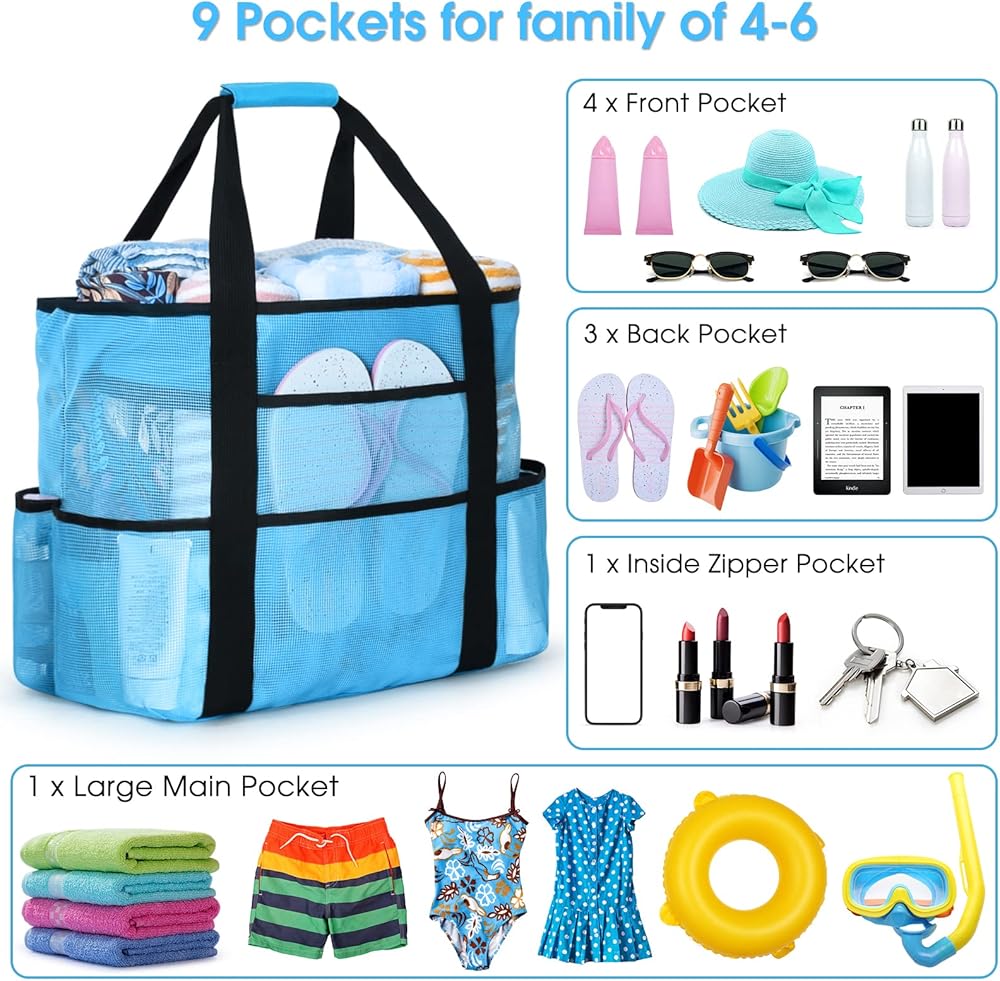 Zipper Closure & 9 Pockets Beach Essentials for Vacation - It contains 7 outside mesh pockets, a big main pocket with zipper closure, 1 waterproof pocket for your phone, key, or cash. All those pocket designs will ensure this beach bag is organized and easy to access your items.