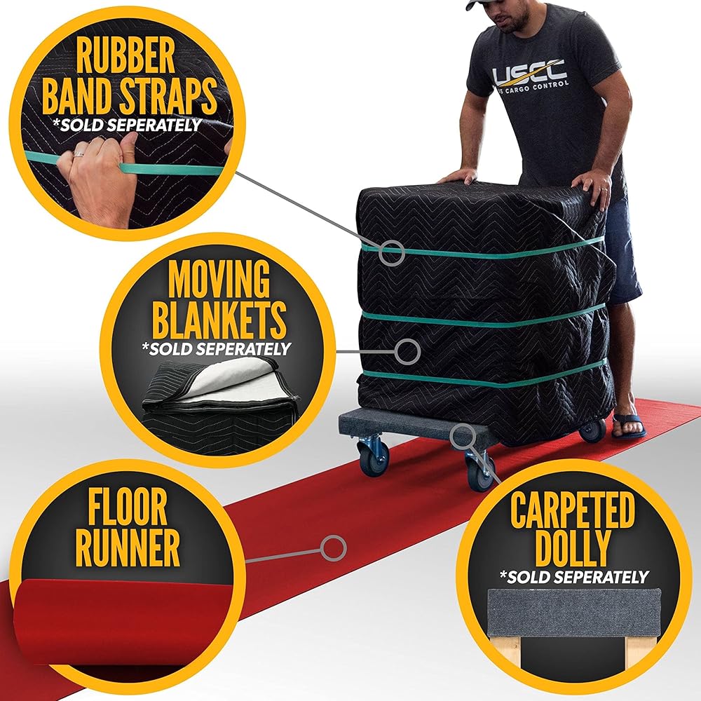 US Cargo Control's Neoprene Floor Runner is perfect for protecting your floors against drops, spills, scuffs, and scratches caused by moving, construction, or foot traffic. These floor runners measure 27" wide and 20' (240") in length. Runners are made with professional grade neoprene synthetic material that is 1.5mm. thick to create a layer of protection with an anti-slip surface for walking and moving equipment like hand trucks and moving dollies. Each product has a non-adhesive backing that clings to any floor type and keeps the floor runner in place while moving things across it or setting items down on it. When not in use, you can roll up the floor runner and put it away for easy storage. Reuse the floor runner by wiping it clean with a damp cloth. You can also cut it to any desired size or length for your specific needs or surface areas. Neoprene floor runners are great for professional or first-time movers for hauling items in or out of buildings, as well as construction workers looking to set items and equipment down without damaging floors. You can also use these runners in your walkway, kitchen, garage, shop, office lobby, or anywhere you see fit to protect your floors. Neoprene floor runners come in different colors: red, blue, or black.